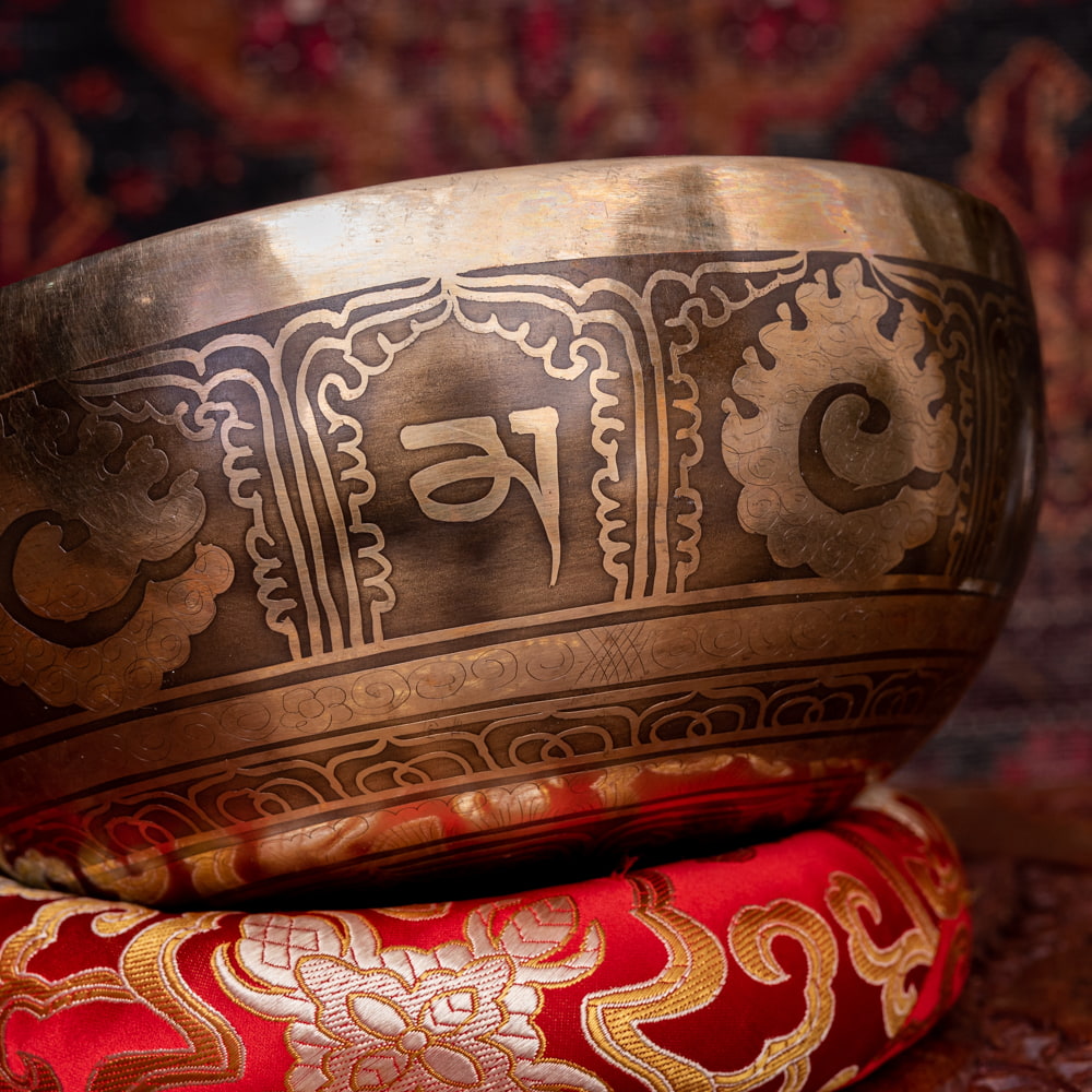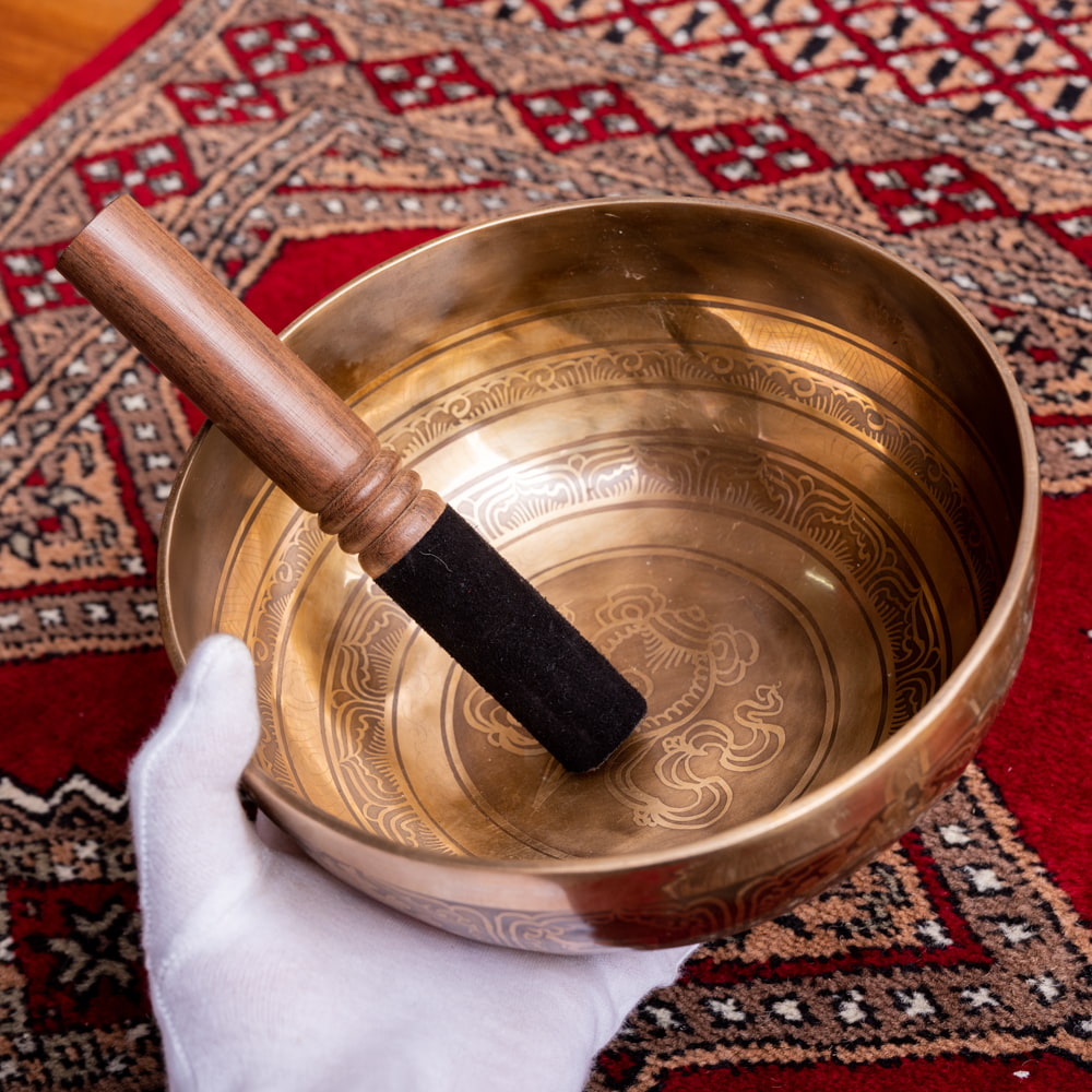 深みのある音色に加え特徴的なのが、職人によって手彫りされた美しい文様です。マントラや、ヴィシュヴァ・ヴァジュラ、アグニ、シャンカなどの吉兆柄に加え、ブッダなどが美しく彫られています。全ての柄をご覧いただけるよう、底面を含め写真に収めておりますので、是非御覧くださいませ。音色だけではなく、視覚的にも楽しく癒してくれる一品です。■シンギングボウルの鳴らし方について■