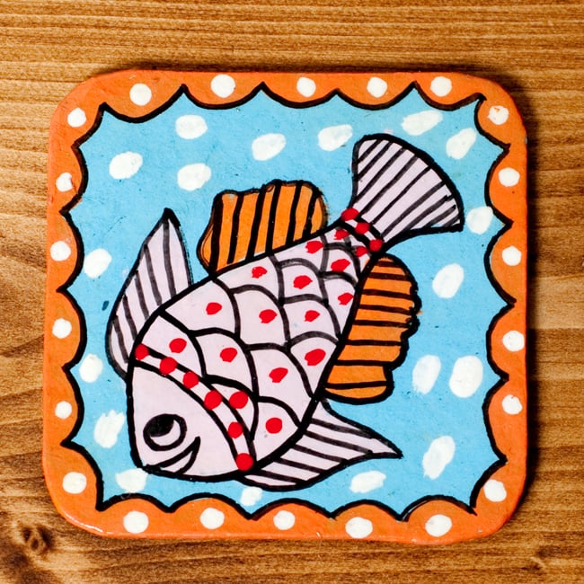 〔四角形〕 ミティラー画のコースター - オレンジ縁×薄ピンク色 お魚の同一カテゴリ商品
