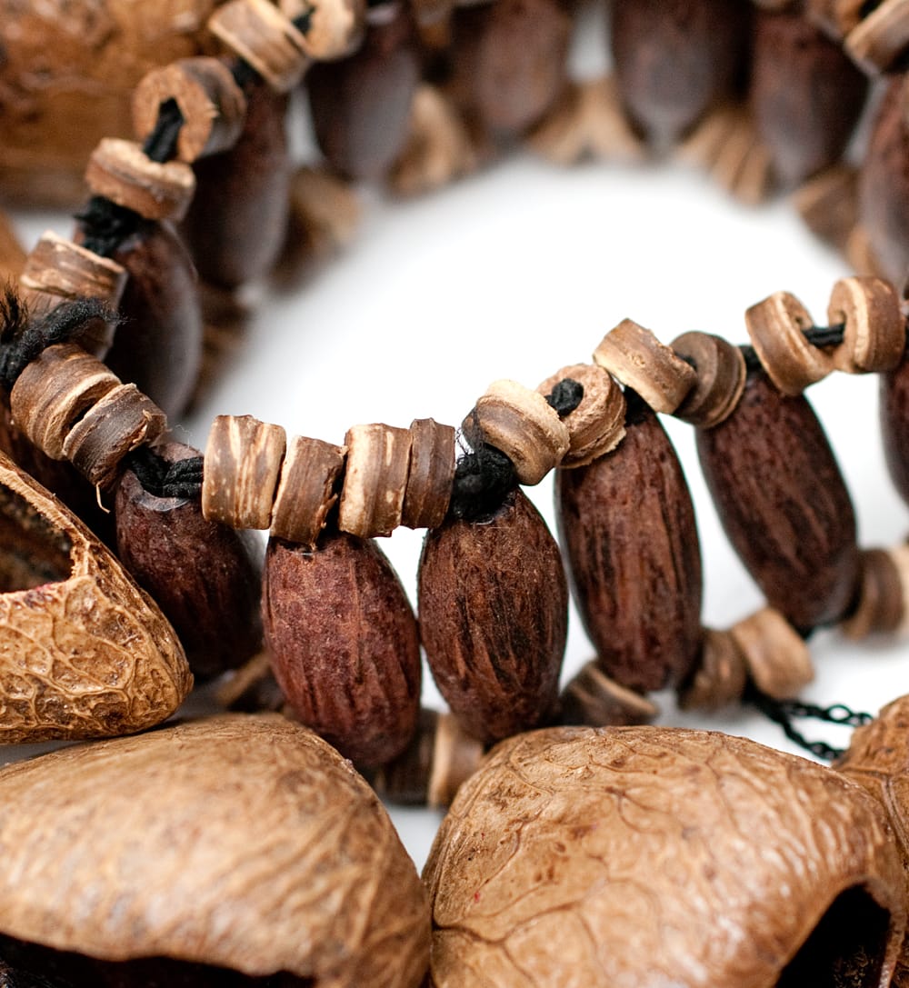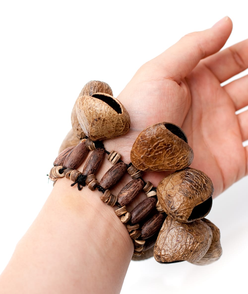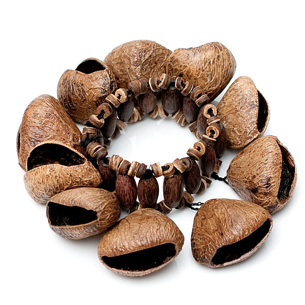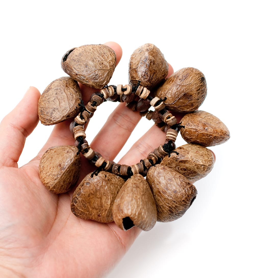 赤道直下の国インドネシアからやってきた楽しい楽器です。手首ににぴったりのブレスですので、手を動かすだけでくくりつけられている実が揺れてガラガラととてもいい音がします。子供からお年寄りまで、楽器ができない人でもとっても簡単に音が出せて遊べる一品です。みんなが喜びそうなグッズですね。