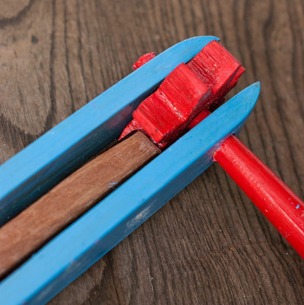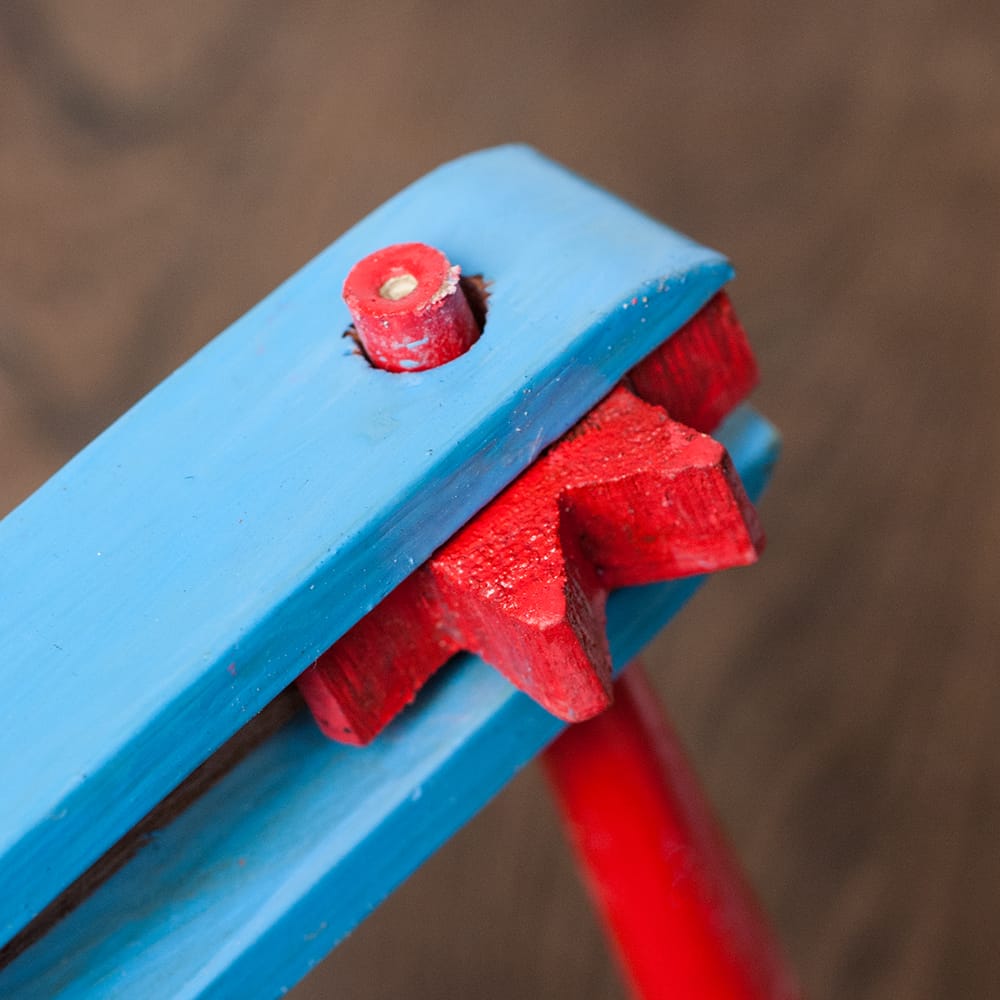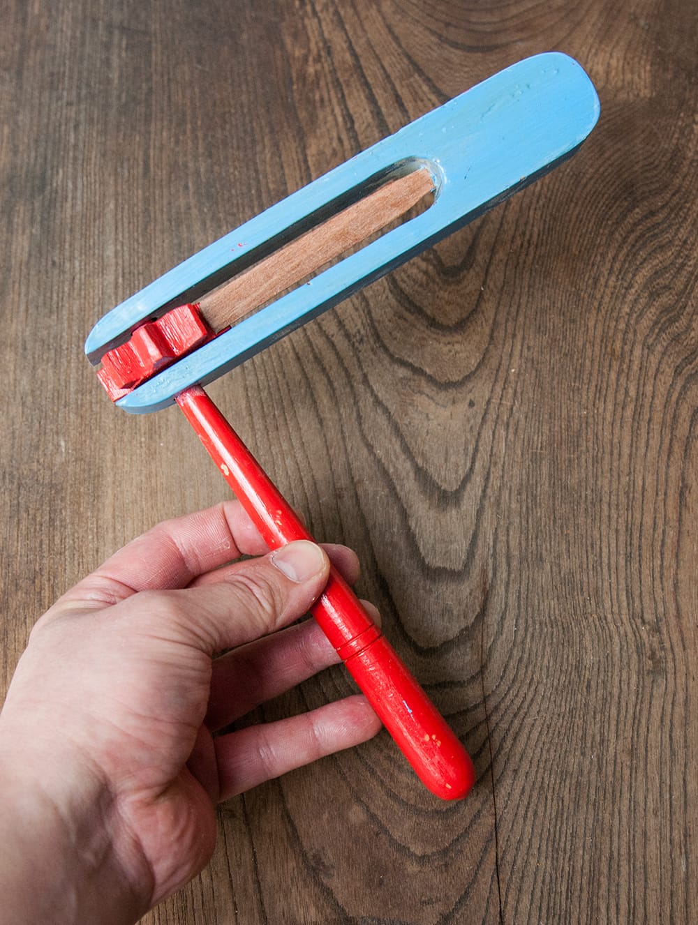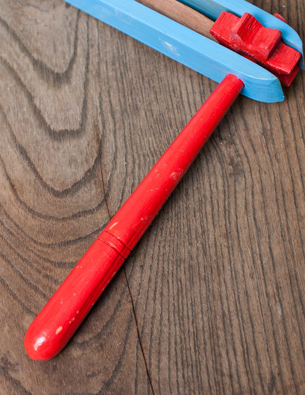 柄を持って、グルグルと回転させてみてください。歯車が板をはじいて、「バチバチバチッ!」と勢いのいい音が鳴ります。木の持つ温かみが生きています。