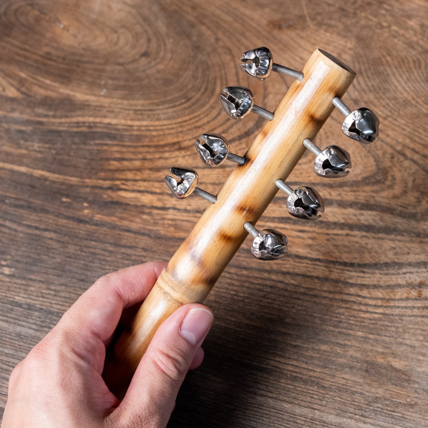 演奏は、ベルが付いている方を下向きに持って、片方の手で楽器を握り、もう片方で握った手を叩き鳴らす方法。ベルが付いている方を、上にした状態で素早く回転させて鳴らす方法。普通に振って鳴らす方法などがございます。