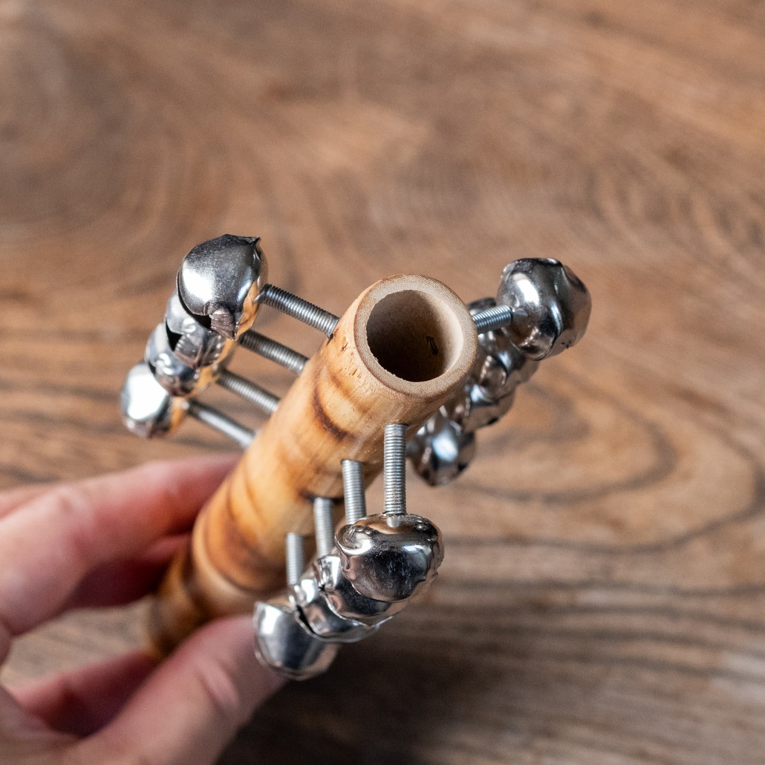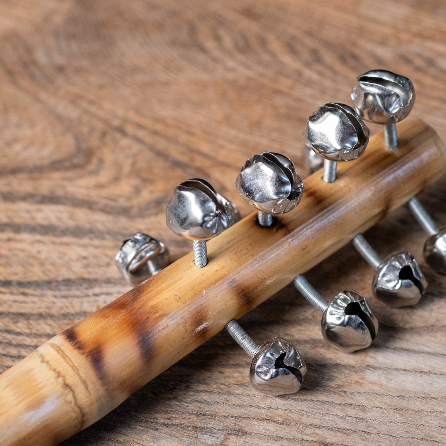 こちらは、棒に鈴が複数個付いたスレイベルという楽器です。クリスマスに空から降りてくる、トナカイの引くそりからシャンシャカ鳴っている、あのベルの音色を想像するとイメージしやすいと思います。クリスマスソングで有名な、ジングルベルなどにもスレイベルが使われております。