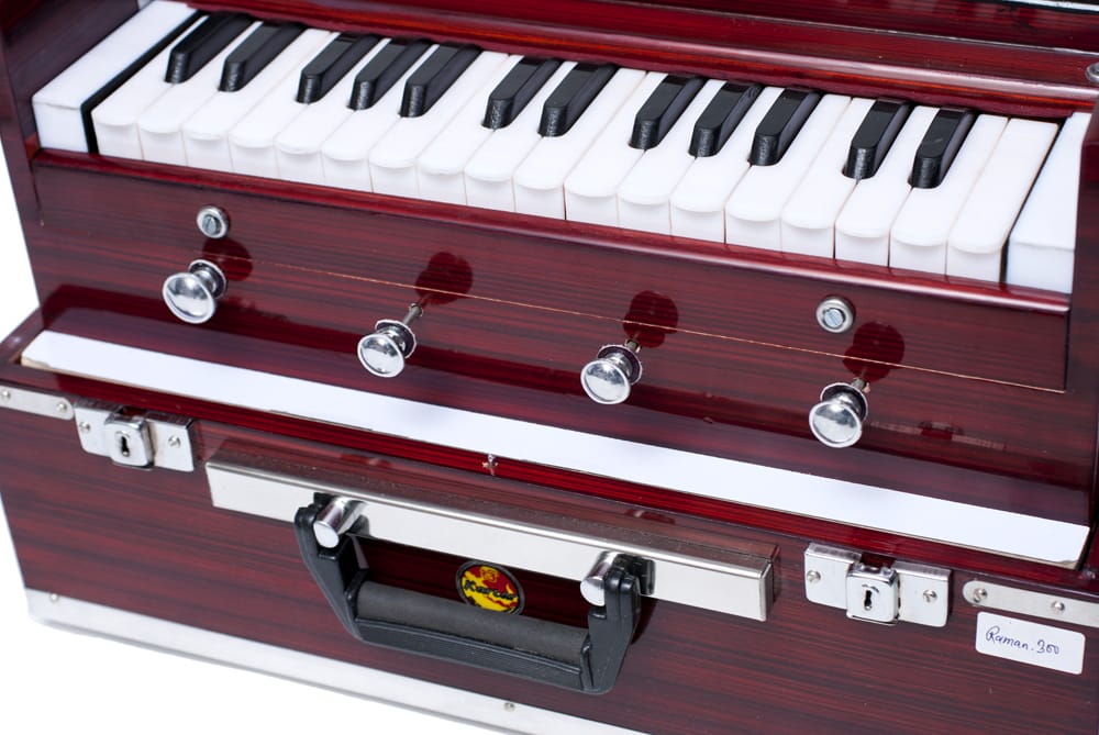 箱の中から出てきてポップアップする、持ち運びに便利なタイプのハルモニウム。ワインレッドの筐体もエレガントで素敵です。リードノブは2つあり音色のコントロールができます。その他にも2つのドローン音がつき、またどちらの手からでもふいごを操作できる左利きの方にも便利な作りになっています。■ハルモニウムのメンテナンスについて