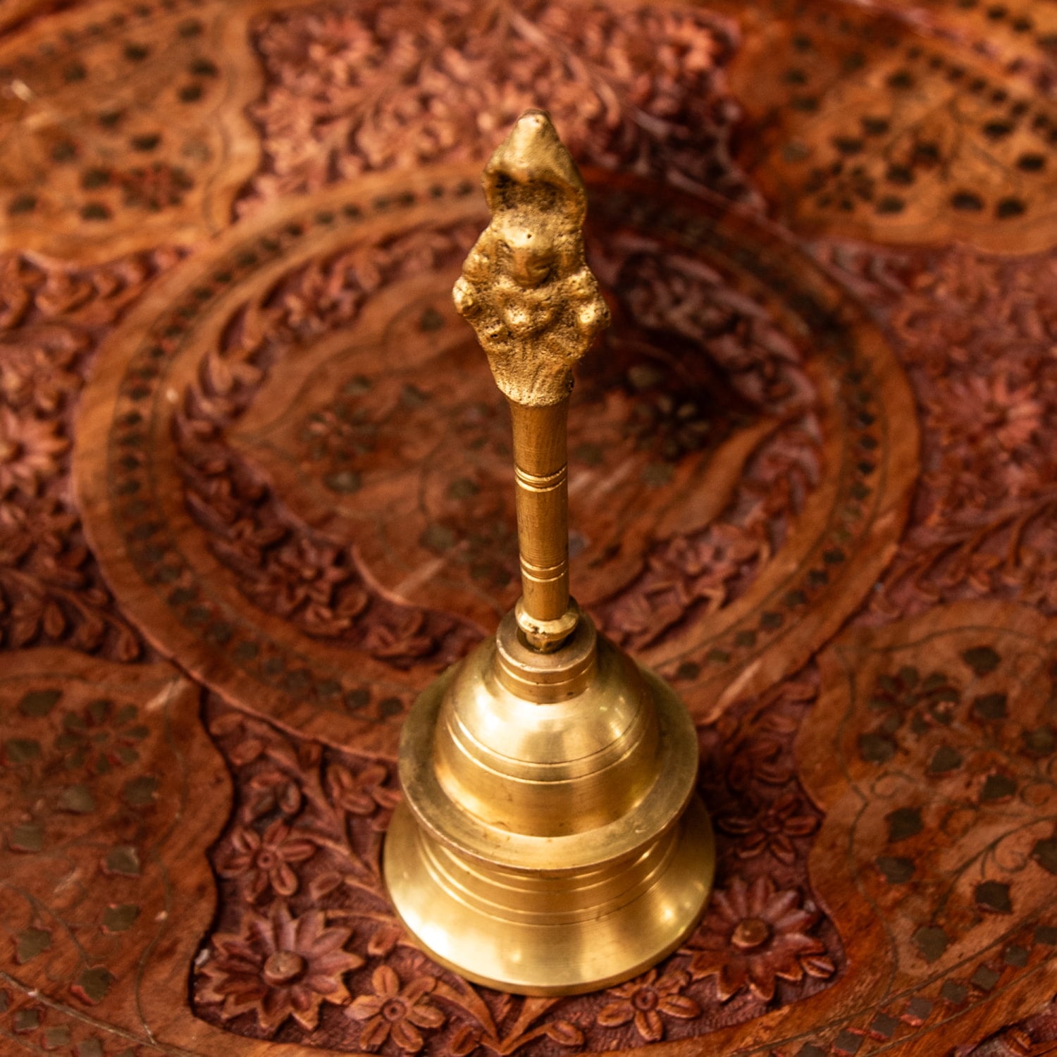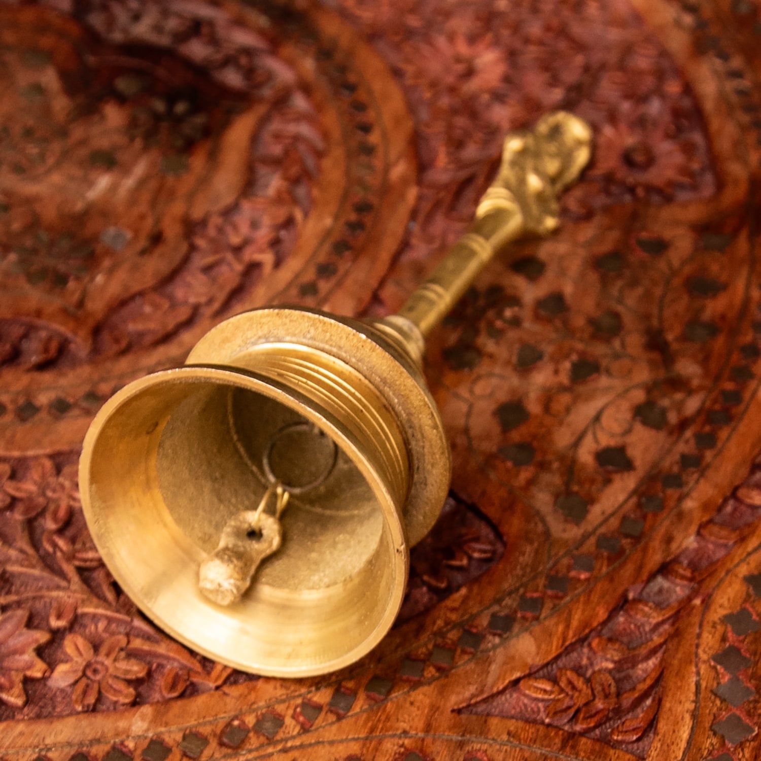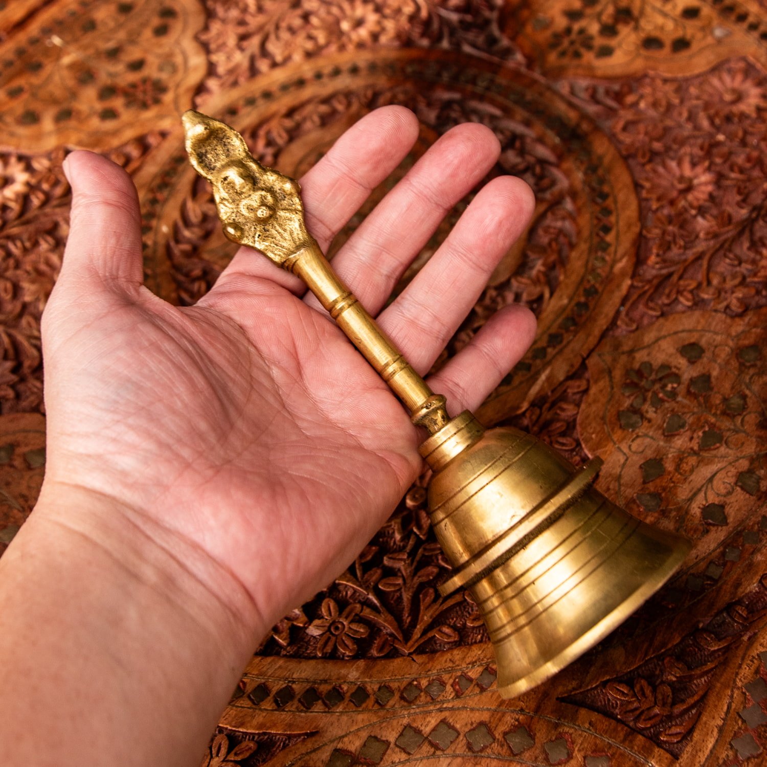 こちらは、インドの聖地バラナシで祭礼用として使用されているハンドベルです。真鍮を型に入れて削りだした、素朴な風合いがインドらしい一品です。音色は澄んでいて涼やかな感じです。