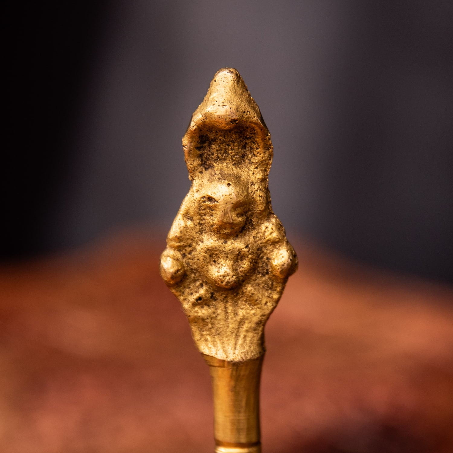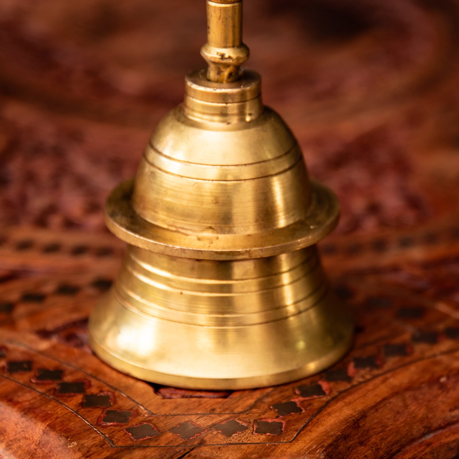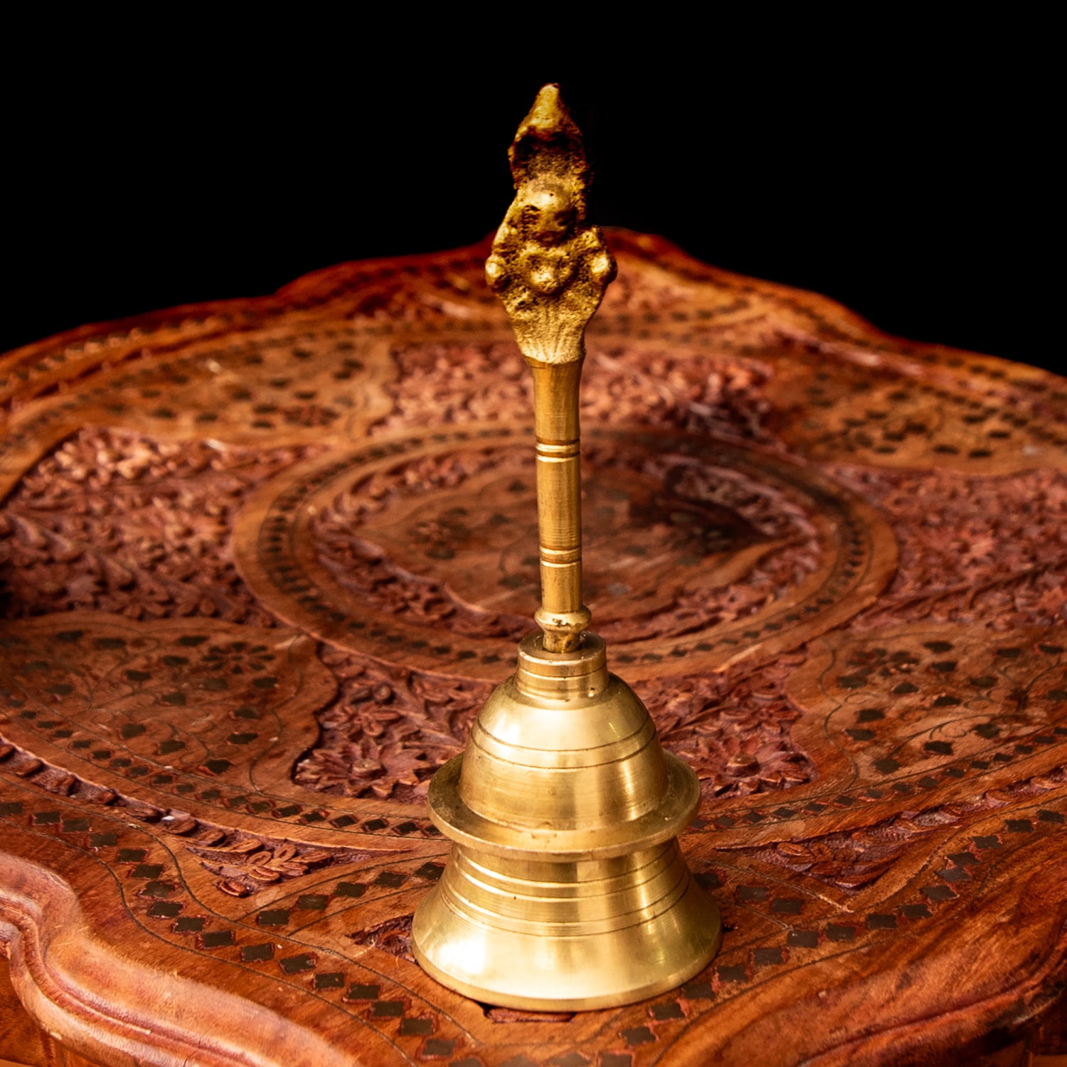 こちらは、インドの聖地バラナシで祭礼用として使用されているハンドベルです。真鍮を型に入れて削りだした、素朴な風合いがインドらしい一品です。音色は澄んでいて涼やかな感じです。