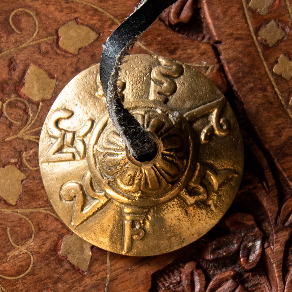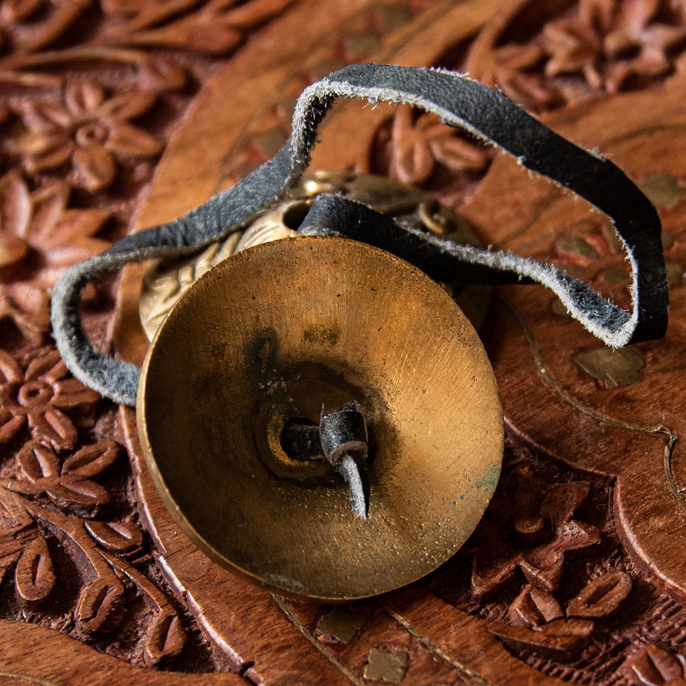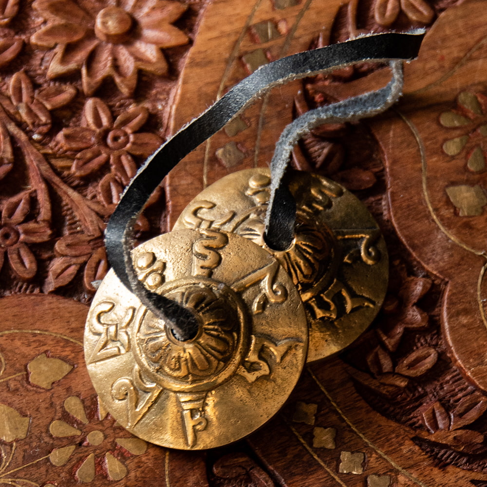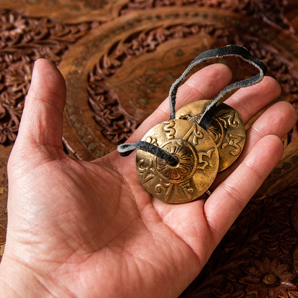 ネパールの宗教音楽に使われているディンシャ。国が違い名前は違っても、文化圏が一緒なので、インドのマンジーラと言われる楽器と大きな違いはありません。ただ、インドのマンジーラが基本的にシンプルなのに対し、ディンシャは中国の影響を受けたと思われる吉兆柄や、チベットの影響を受けたと思われるチベット仏教の真言オンマニペメフムや、ドラゴンなどが彫られ、より魅力的なアイテムに仕上がっています。