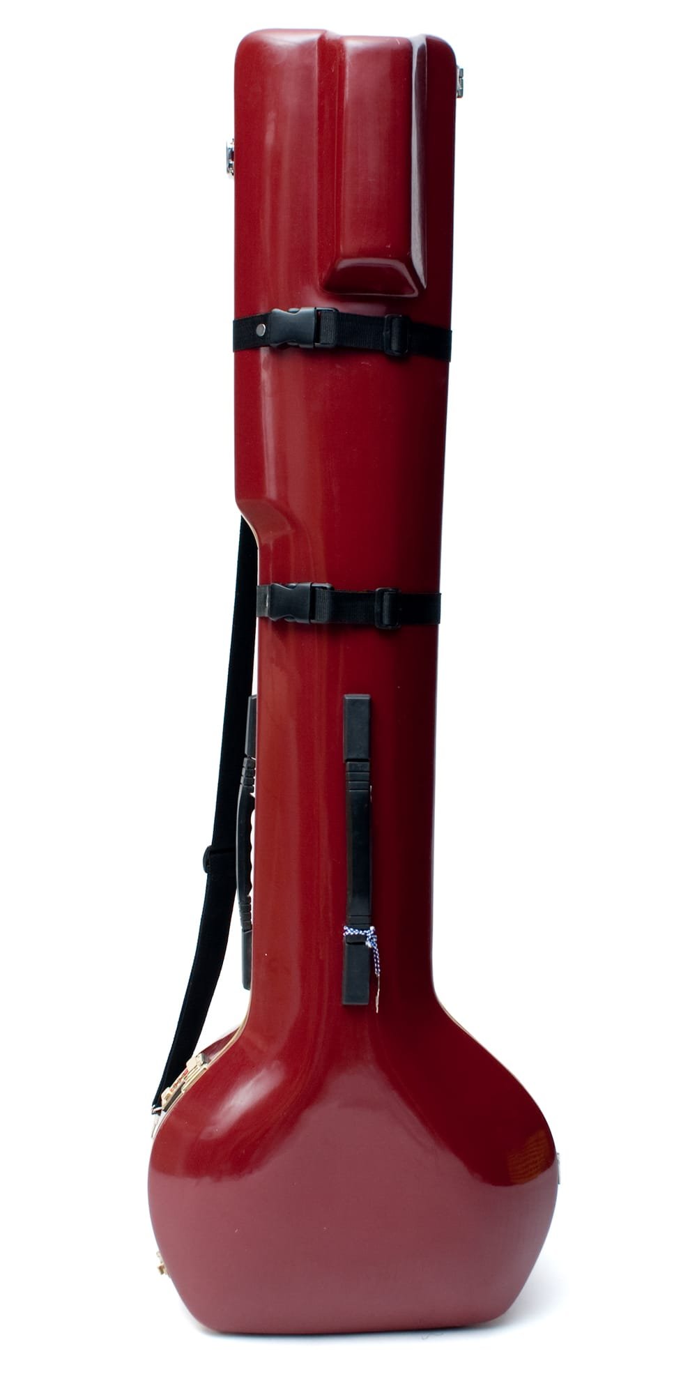 また、このシタールには当店売価4万5千円相当のグラスファイバー製のケースが付属しています。グラスファイバー製のケースは通常のケースに比べて高いのですが、やっぱりすごく丈夫!! 通常のハードケースでも保管用としてはあまり問題がないのですが、強い衝撃が加わると壊れてしまいます。例えば宅急便で送る時や、飛行機に預けるときなど、荷物が投げられる場合がありますが、そうするとシタールは簡単に壊れてしまうのですね。せっかくのシタール、壊れてしまうのはやはり悲しいと思います。ここだけの話、ティラキタから送ったシタールも2割は宅急便会社に壊されてしまっていたのです