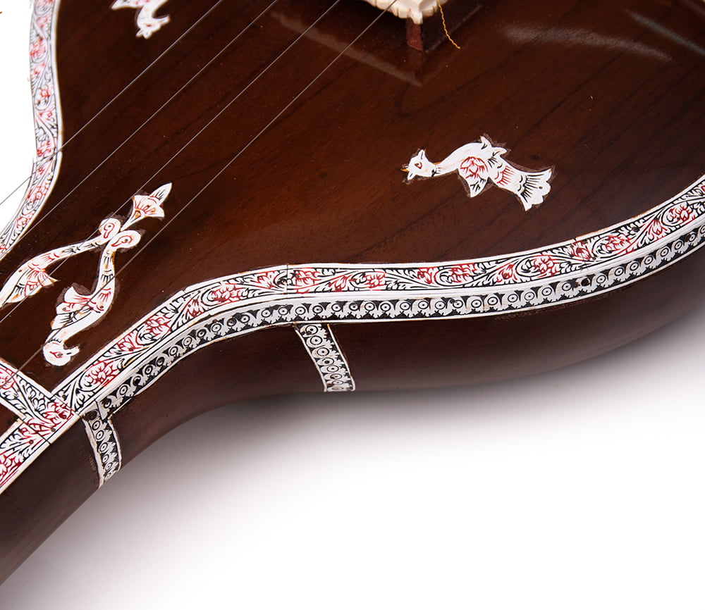 タンプーラは器楽や声楽のときに使用される伴奏用の楽器です。この楽器は4つの弦しか付いていず、フレットもなく、ただ4つの音を順番に出すためだけの楽器なので、単体で独奏をすると言う事は、ありません。ただ、この楽器があるのとないのとでは演奏時の雰囲気はまったく違うものになります。4つの弦は、Pa(ソ)、Sa(ド)、Sa(ド)、Sa(1音低いド)に調弦されます。このタンプーラは伝統のKanai Lal & Sons社。装飾も美しく良いクオリティ。代え弦が5組と、ソフトケースが1個が付属します。