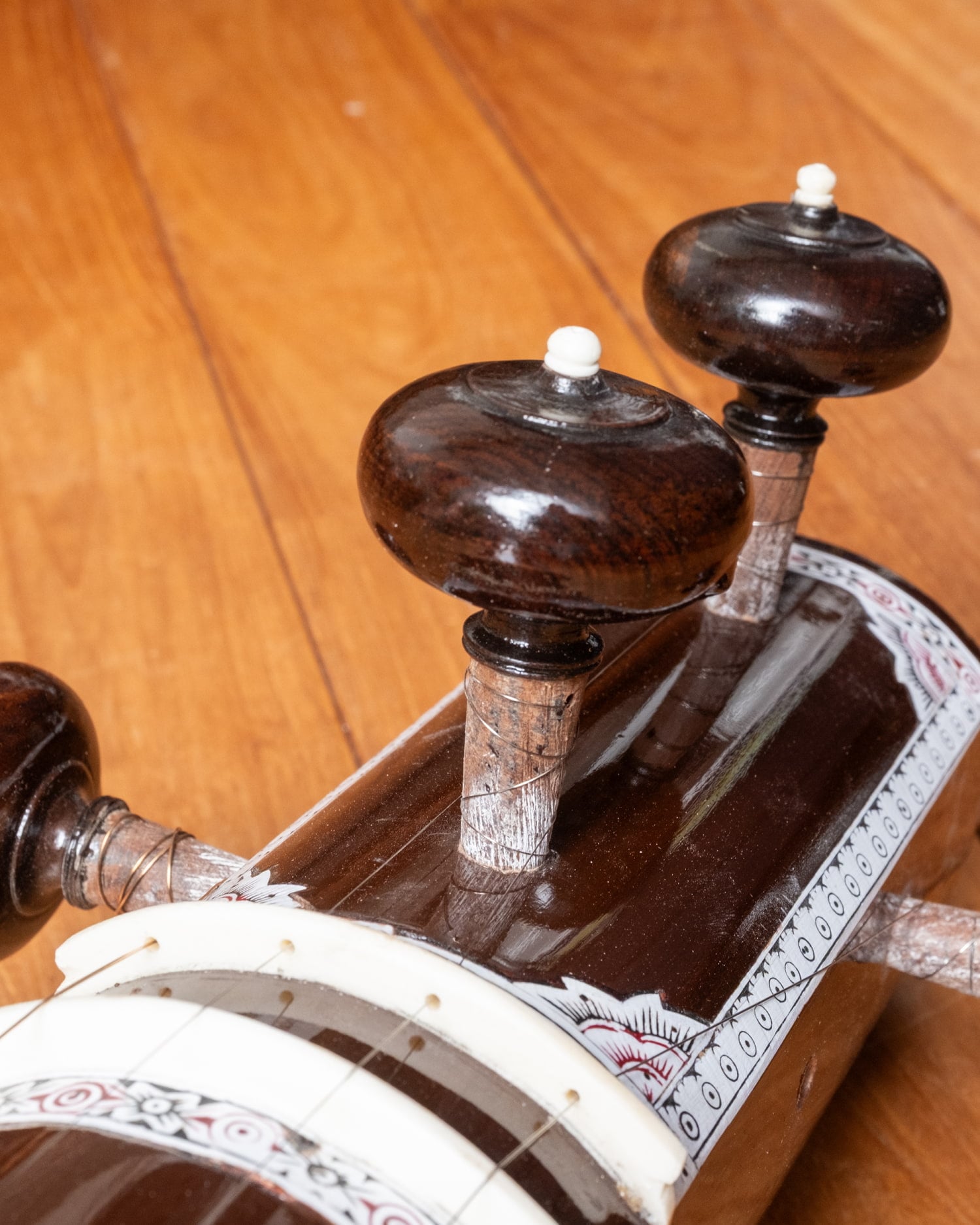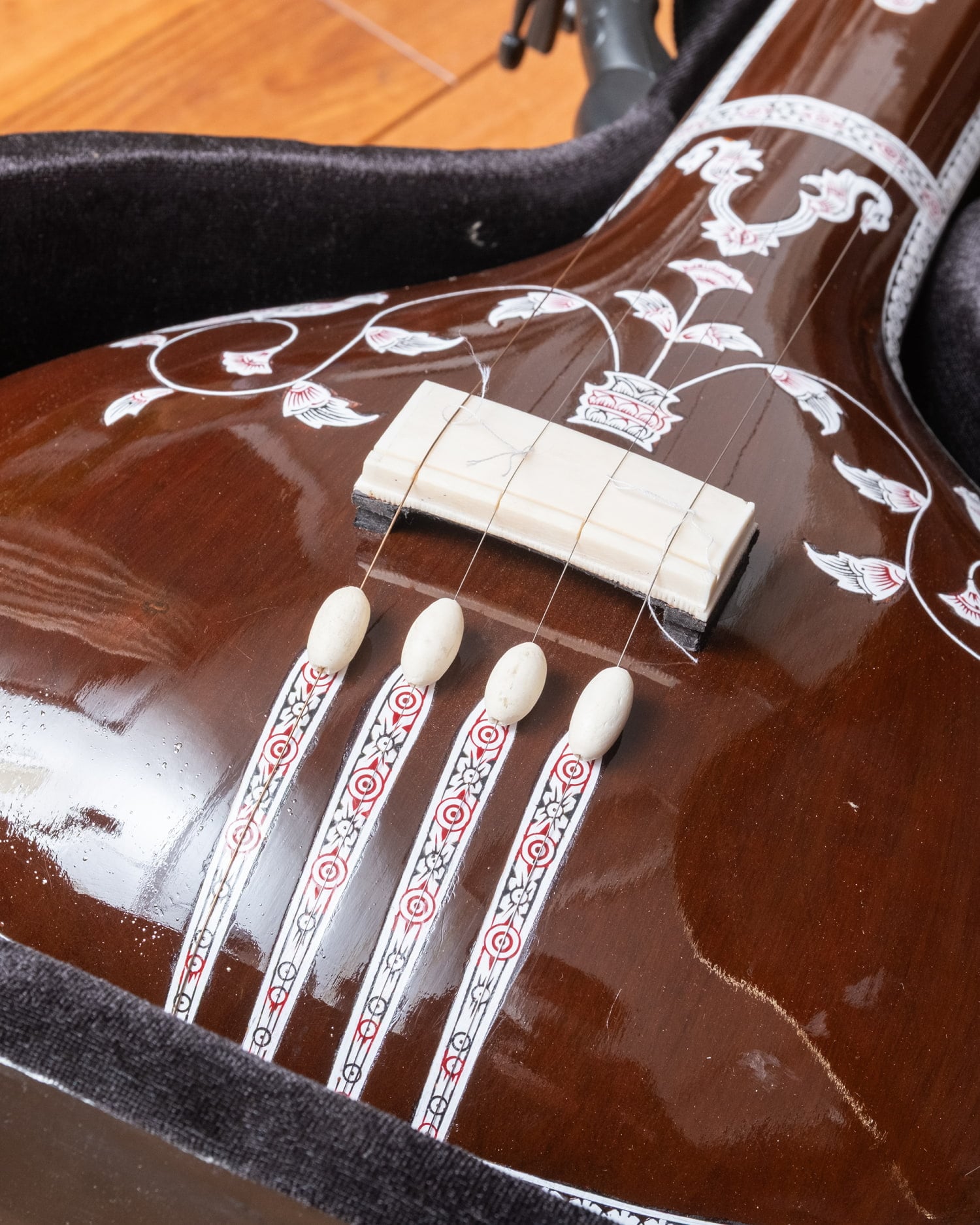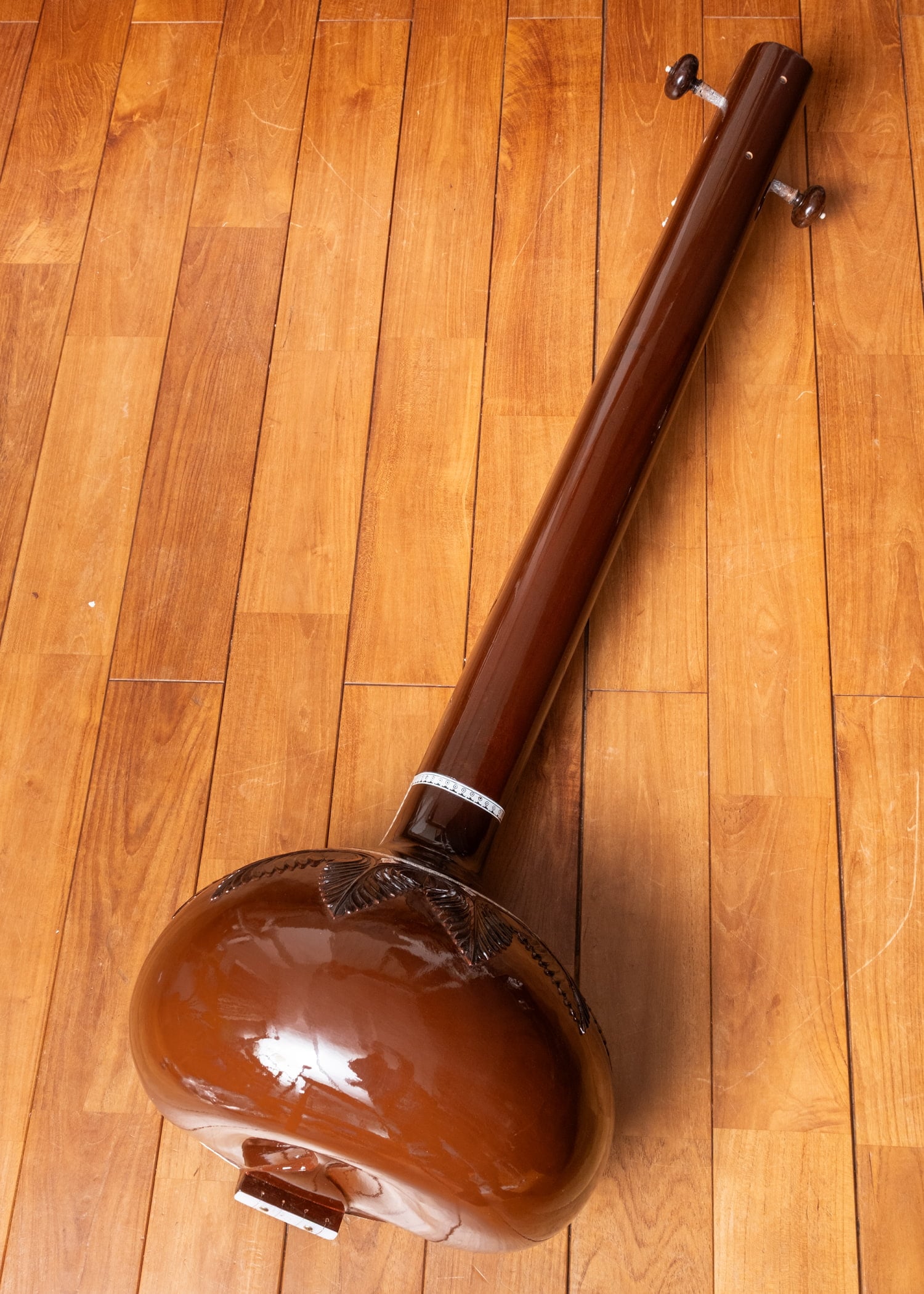 標準的な調弦はPa(第5音)・Sa(主音)・Sa(主音)・Sa(1オクターブ低い主音)ですが、ラーガや演奏者の声域・好みによって調弦を変えることもあります。たとえばPaを持たないラーガではMaやNiに変えることもあります。■ このモデルについて