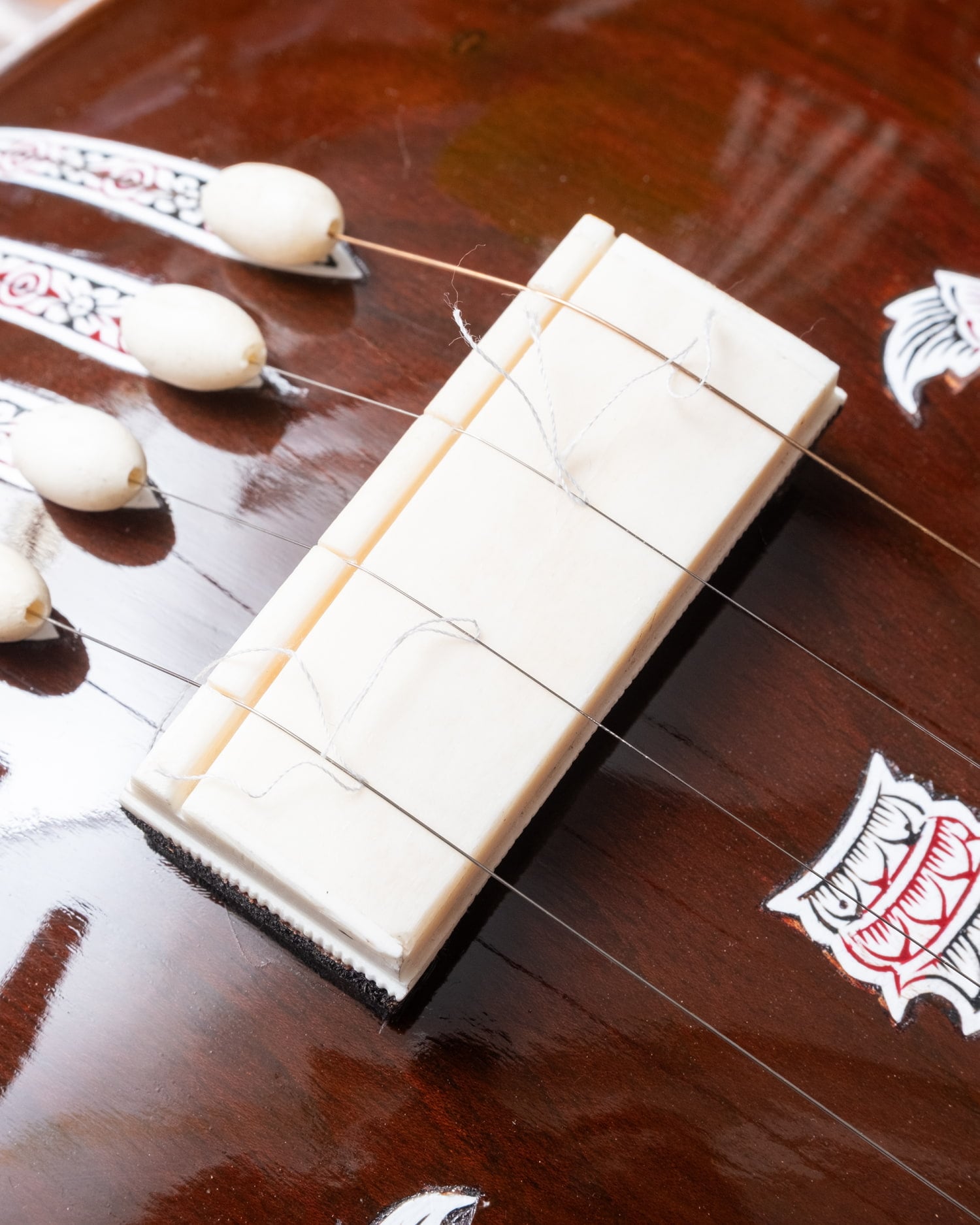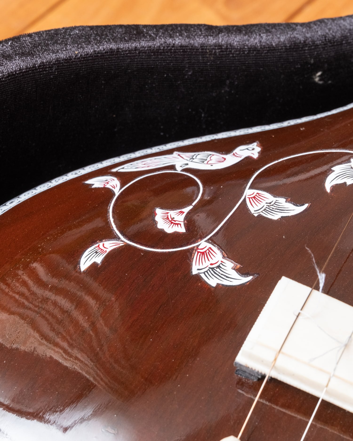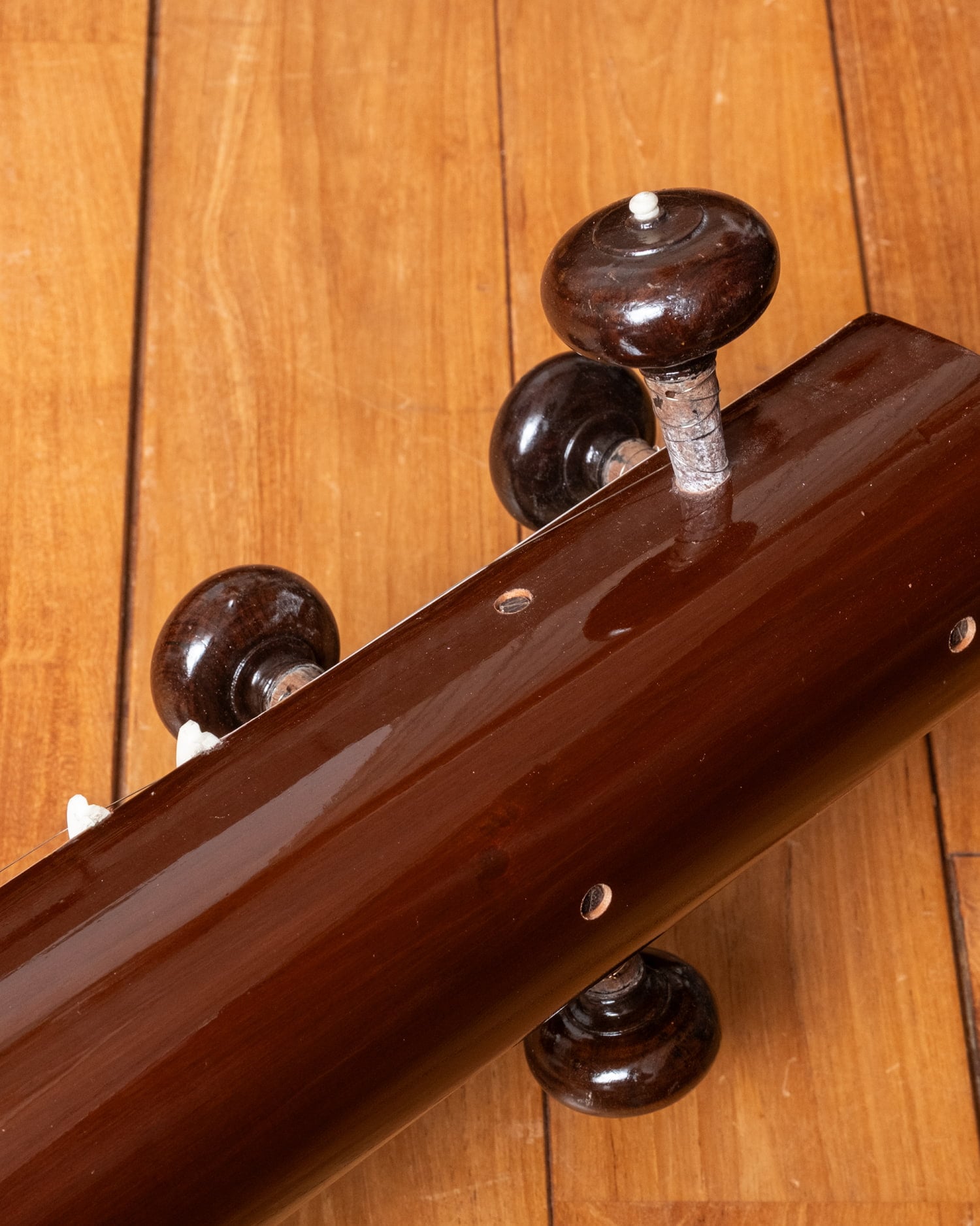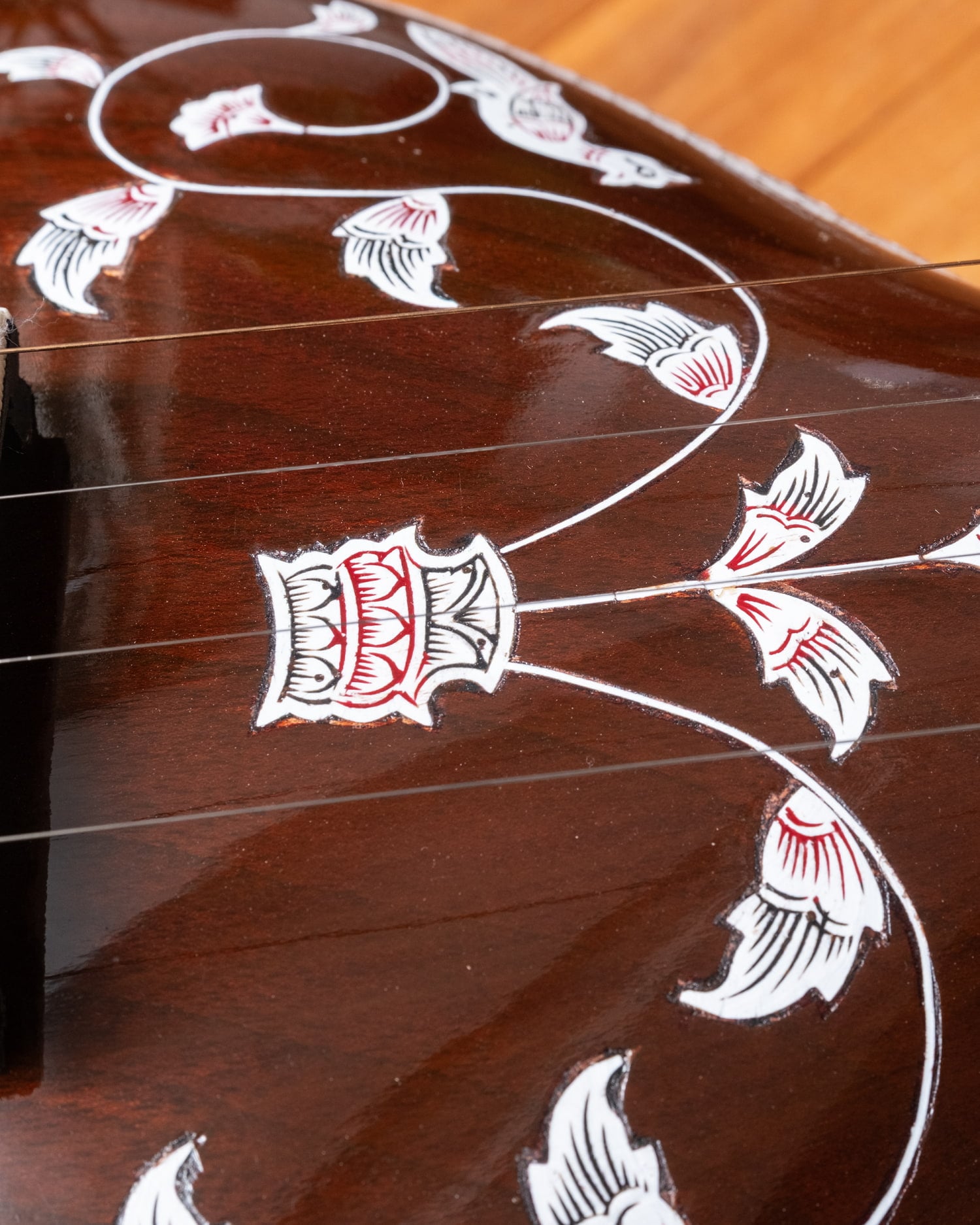 標準的な調弦はPa(第5音)・Sa(主音)・Sa(主音)・Sa(1オクターブ低い主音)ですが、ラーガや演奏者の声域・好みによって調弦を変えることもあります。たとえばPaを持たないラーガではMaやNiに変えることもあります。■ このモデルについて