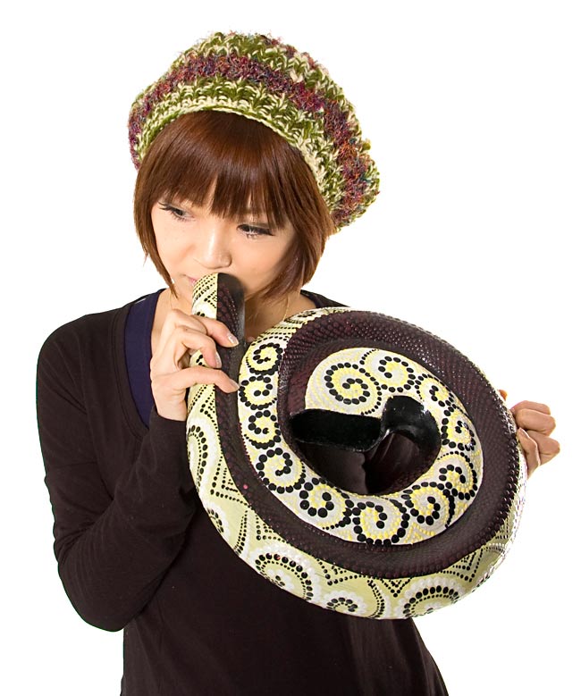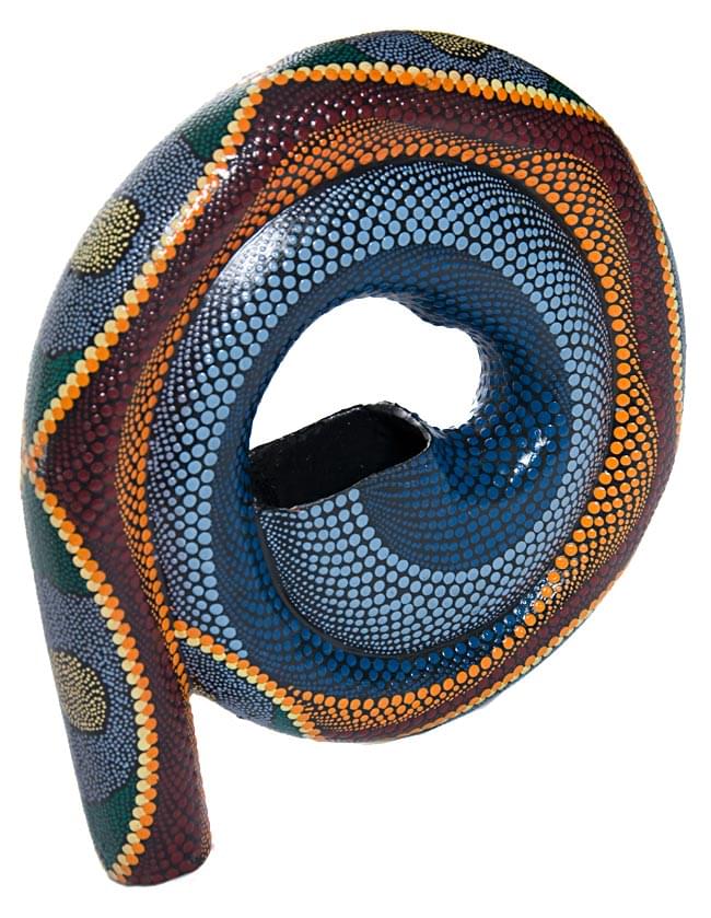 こちらのスパイラル・ディジュリドゥの管は、音の出口が耳に近く演奏しやすいのが特徴です。また、こちらのスパイラル・ディジュリドゥの管は、伸ばすと1.4mほどにもなる為、音質もとてもいいです。※実際には伸ばす事はできません。