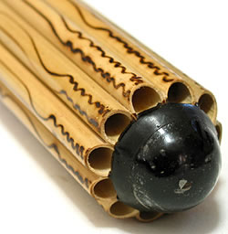 ヴォットと呼ばれるタイの回して使用する笛。黒い部分を下唇のちょっと下に当て、上に息を吹きかけ、両手で回しながら演奏します。一本一本の笛の端が閉じている事から、ペルーのサンポーニャと同種類の笛と言うことが出来ます