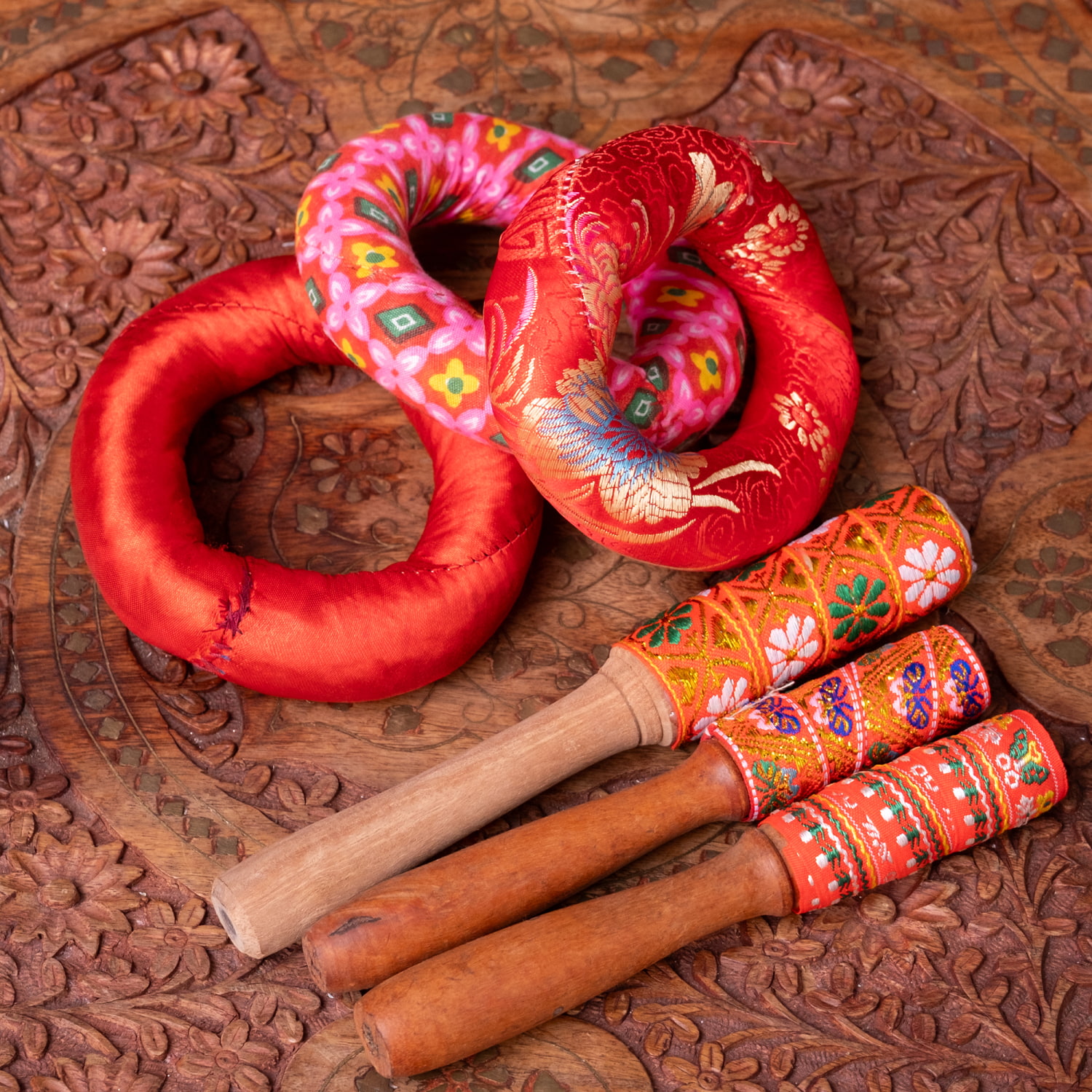 | 備考 | ハンドメイド品の為、彫りには個体差がございます。また、付属のバチと台座は部分的にホツレがある場合がございます。使用される布により、どちらも赤系の同じ雰囲気の物になりますが、写真とは色合いや模様が異なることがございます。 |