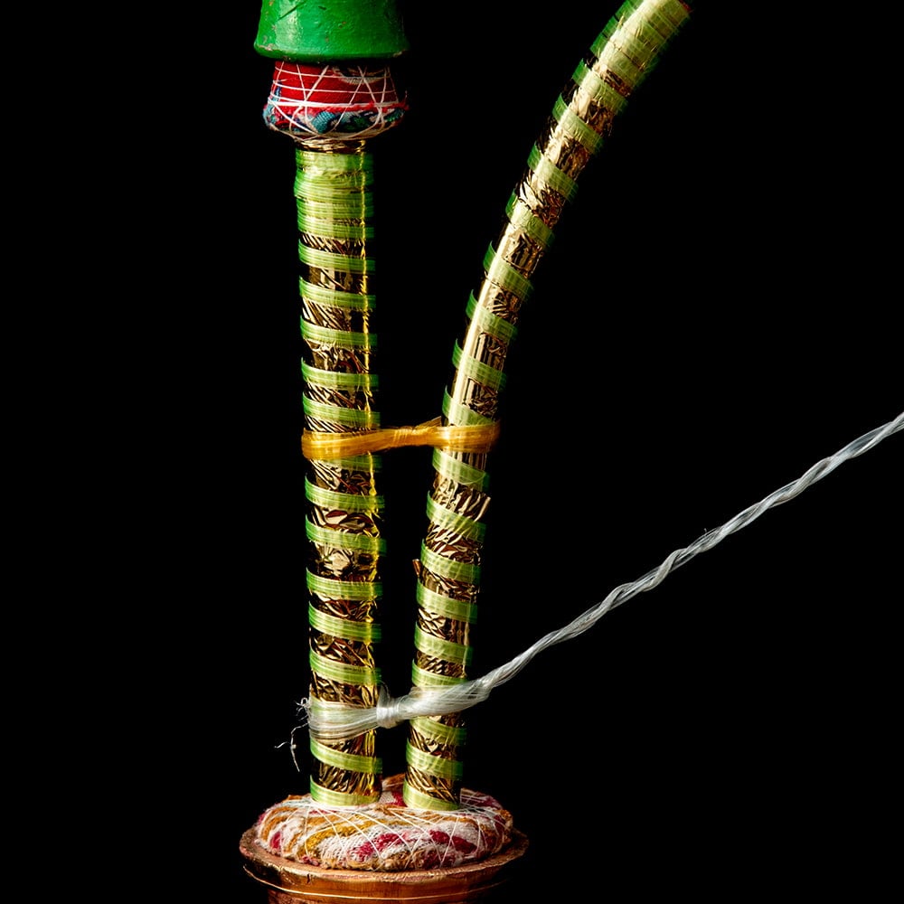 インド極北の地カシミールから届いた本格シーシャです。現在では世界各国で広く知られるようになったシーシャですが、一説にはインド北部が起源とされています。その地がカシミールであるかは一考の余地がありますが、近年のカジュアルなガラス製シーシャとは異なり、現在でも現地の生活に溶け込み活躍している超本格のシーシャです。グラマラスなボトルやプリミティブな竹を用いた造形は異国情緒たっぷりな一品です。本場仕様ならではの粗さもあります。ボトル部分は金属を継ぎ合わせているため、隙間があり水漏れすることがあります。現地ではその都度蝋を溶かして穴を塞いでいますので、御理解の上お買い求めくださいませ。