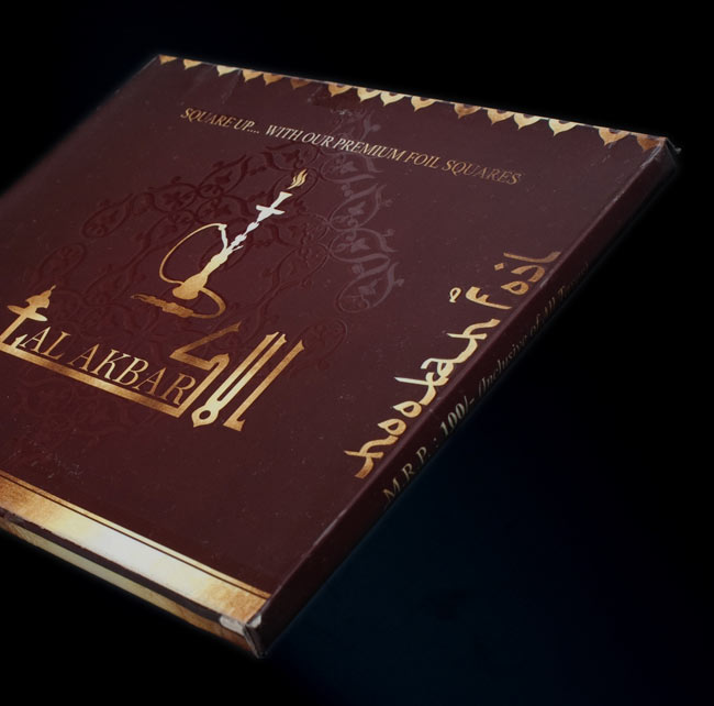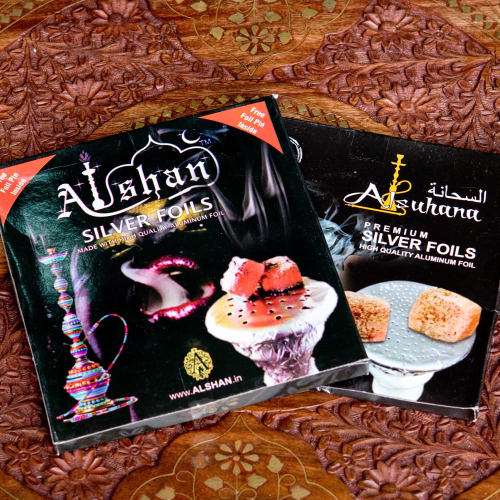 インド現地で売られている、水タバコ用のアルミホイルです。こちらのアルミホイルはちょうど良いサイズに切り取られているので、開封してすぐに水タバコへお使いいただくことができます。一パックにつき大容量の40-50枚入っているので、一パックお買い求めいただければ40-50回分お使いいただけます。