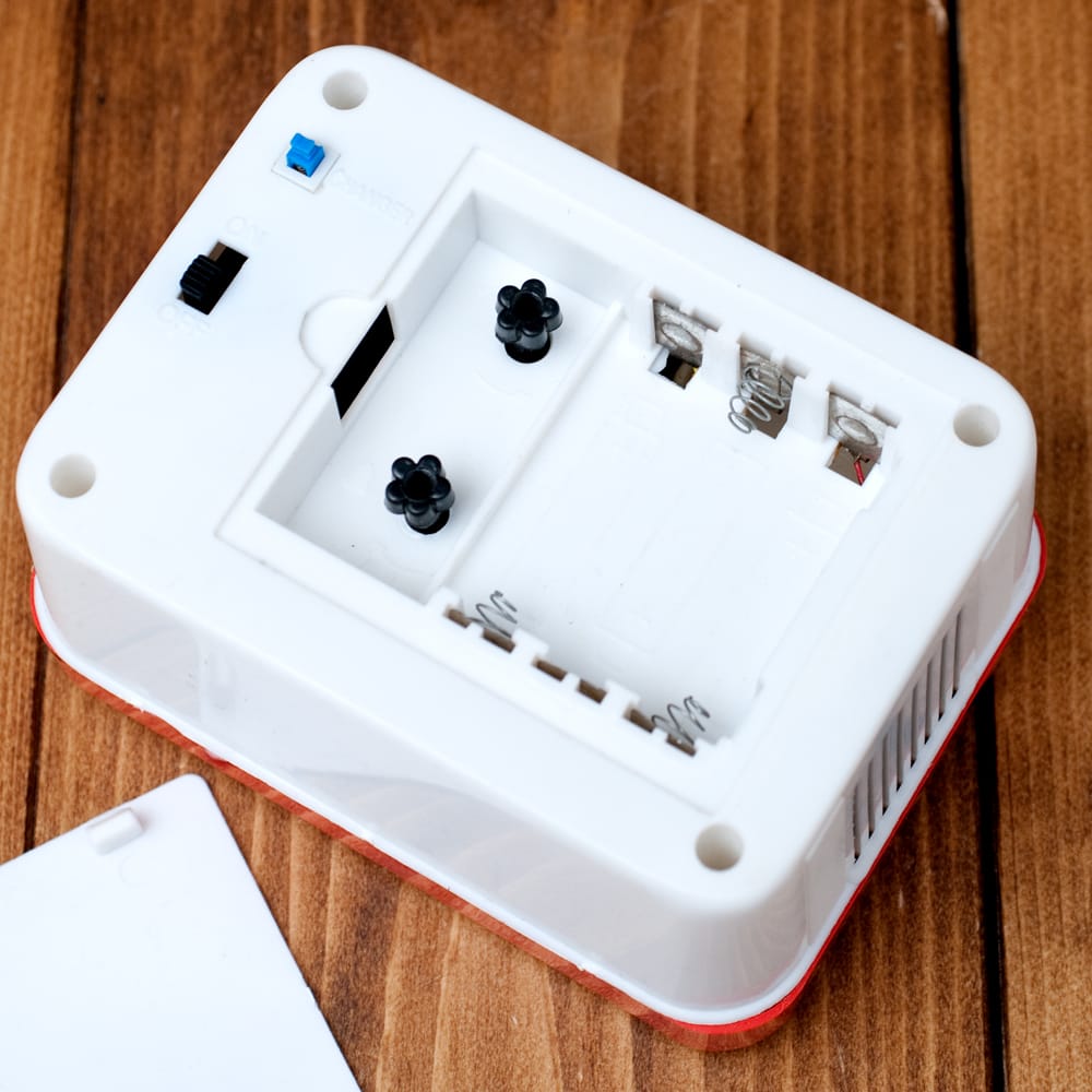 早朝、突然「インドの歌」が大きな音量で詠唱されると、近所の人から怪しまれるのは目に見えています。岡山のような環境で使用する場合は、夏の間は使用を自粛したほうがよろしいのでは、と思われます。それくらい大きな音量です。私は、近い将来、可変抵抗をつけて音量調節ができるようにしようと考えています。もちろんこの時計はそのような改造ができる構造をしており、またそのキャパシティーがあります。このフレキシビリティーはすごい!!ライト機能もすごい!!明るいのです。角度を変えれば懐中電灯としても使えそうです。最後にこの時計は3本の単三電池で動くのですが、何と、「時計機能」は、一本だけで動かせるのです。電池ボックスの一番右側に一本だけ入れておけば、時計はちゃんと動きます。合理的ですごい!!