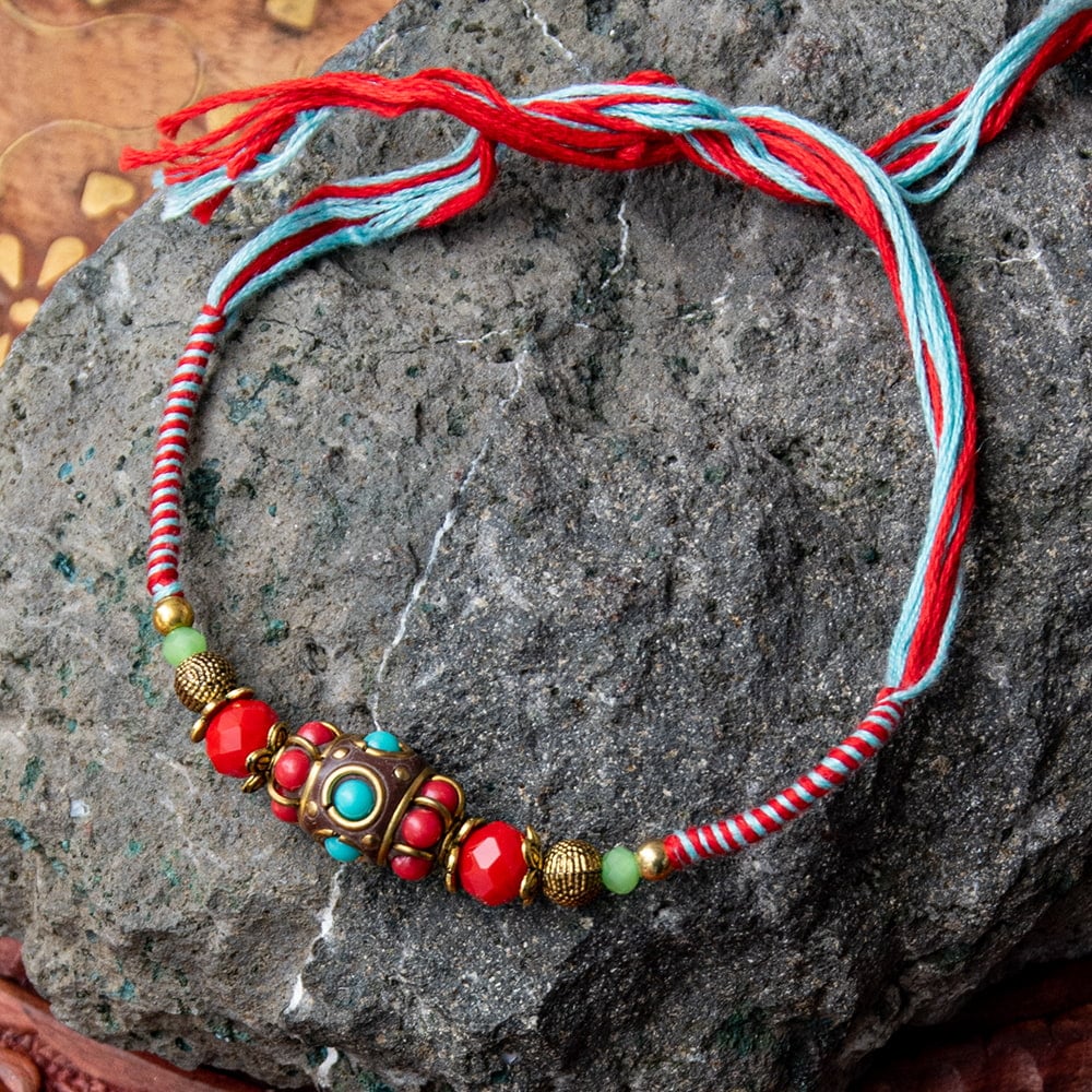 シンプルなデザインの中にインドらしさが光り、兄弟の幸運を祈る幸運の意味があるブレスレット。特にラクシャー・バンダンの日でなくても、つけていると幸運がやってくるかのようです。紐を結ぶだけの簡単タイプなので、ブレスレットにもアンクレットにもご使用いただけます。1本だけでなく、何本か重ねづけをしてもとっても可愛いですね。