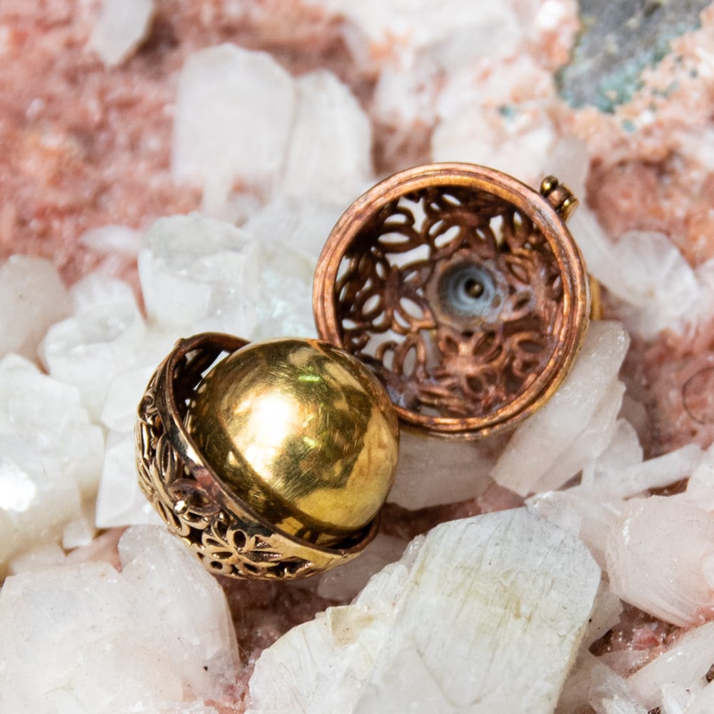 透かし彫りの外装の中に 薄球形のガムランボールが入っている ペンダントトップです。