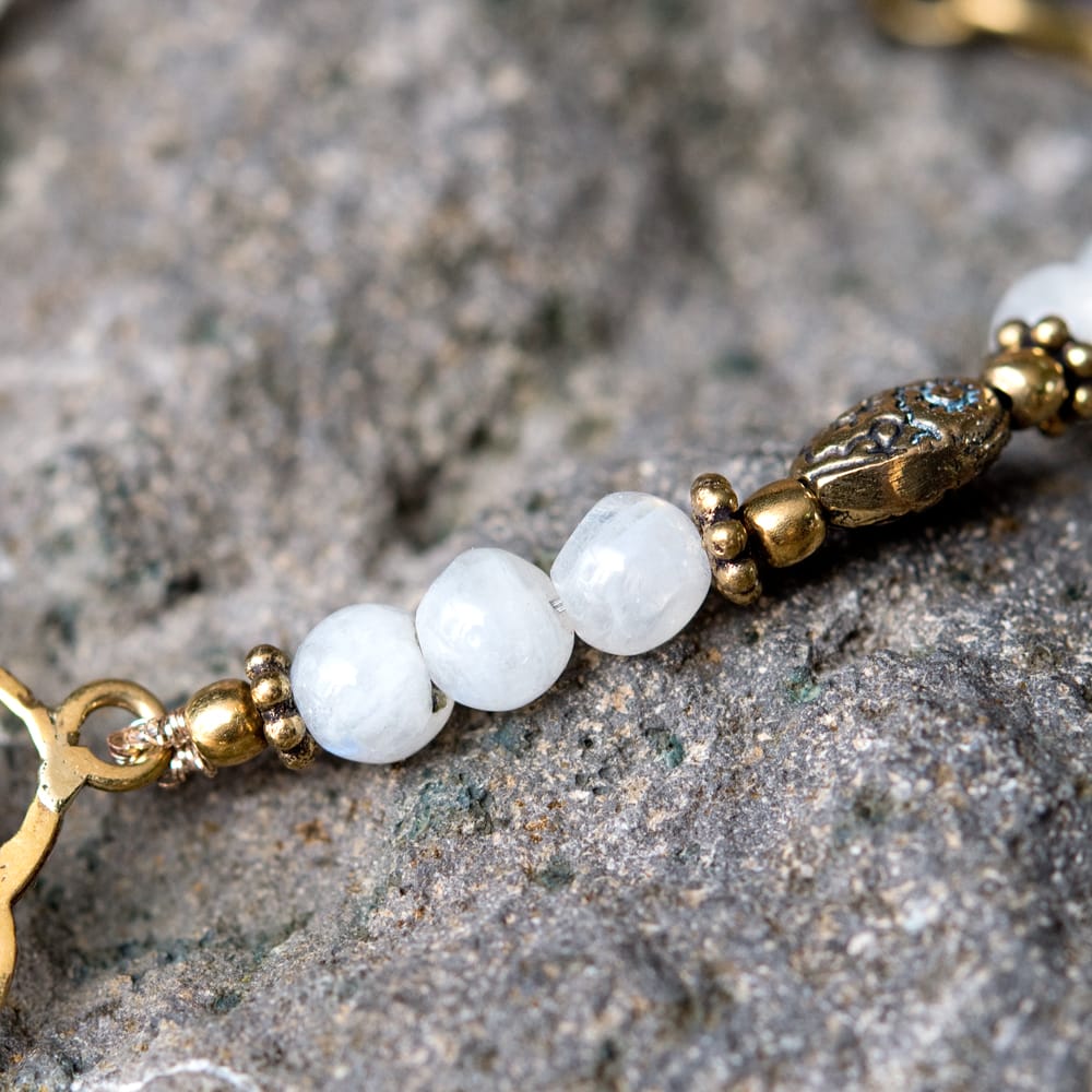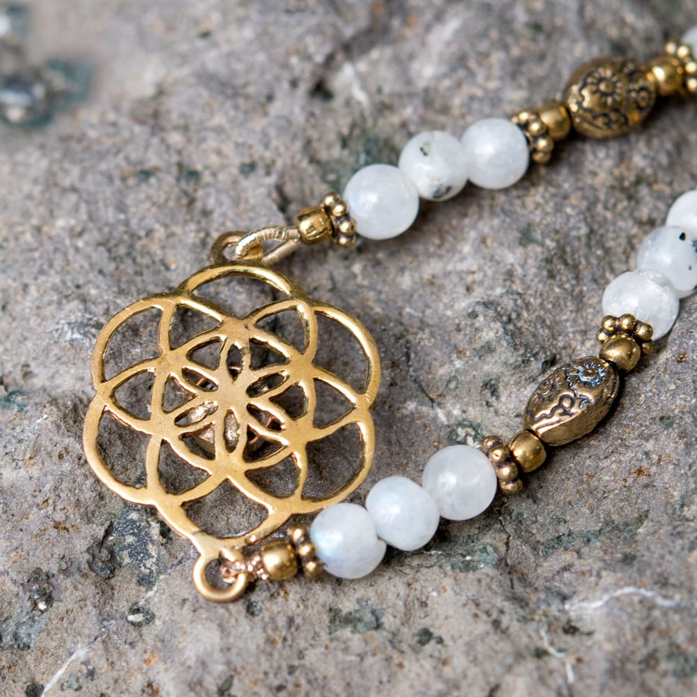 薄く金色掛かったモチーフの土台をベースに、ストーンをあしらったブレスレットです。インド人にとって宝石は身を飾るもの以上の意味合いがあり、占星術的観点からも重宝されています。■シード・オブ・ライフ Seed of life