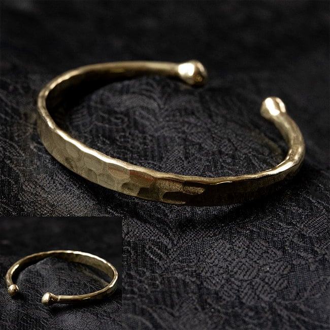 インドには真鍮製品が沢山ありますが、その中でも特に美しさを感じるのがアクセサリーです。こちらのバングルは表面に槌目模様が打ち付けられており、光に当たると陰影が生まとても上品で美しいです。日本人の肌にも馴染む黄〜オレンジがかった高級感のあるゴールドカラー、真鍮にシルバーメッキ加工をしたシルバーカラーの2種類をご用意致しました。