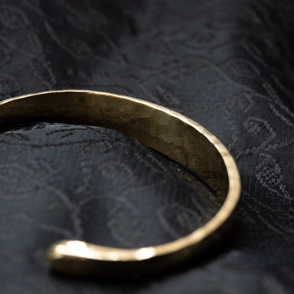 インドには真鍮製品が沢山ありますが、その中でも特に美しさを感じるのがアクセサリーです。こちらのバングルは表面に槌目模様が打ち付けられており、光に当たると陰影が生まとても上品で美しいです。日本人の肌にも馴染む黄〜オレンジがかった高級感のあるゴールドカラー、真鍮にシルバーメッキ加工をしたシルバーカラーの2種類をご用意致しました。