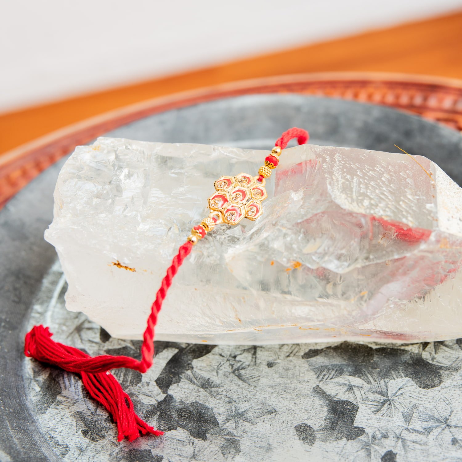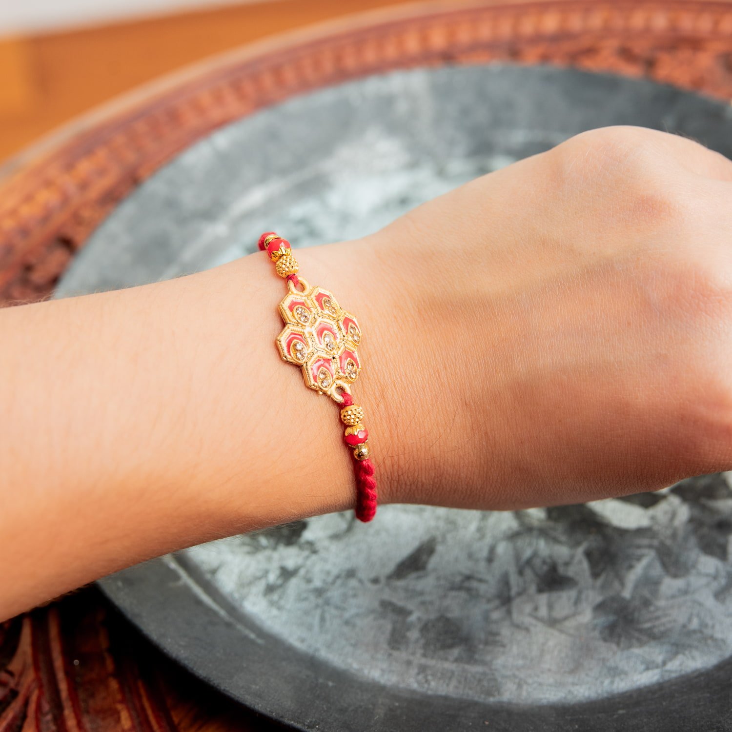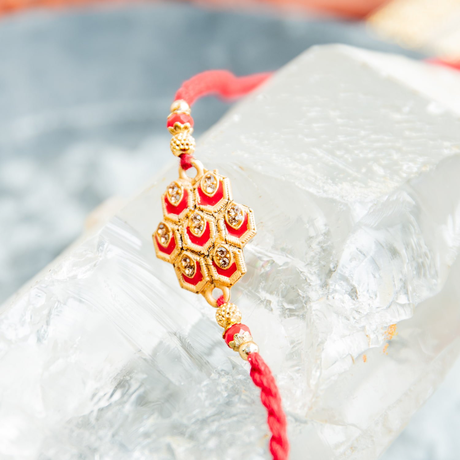トップのモチーフにはそれぞれインドらしさが光る、素敵なデザインです。こちらは幾何学的なハニカムパターンの中にキラキラのダイヤを置いた、ゴージャスなデザインです。兄弟の幸運を祈る幸運の意味があるブレスレット。特にラクシャー・バンダンの日でなくても、つけていると幸運がやってくるかのようです。