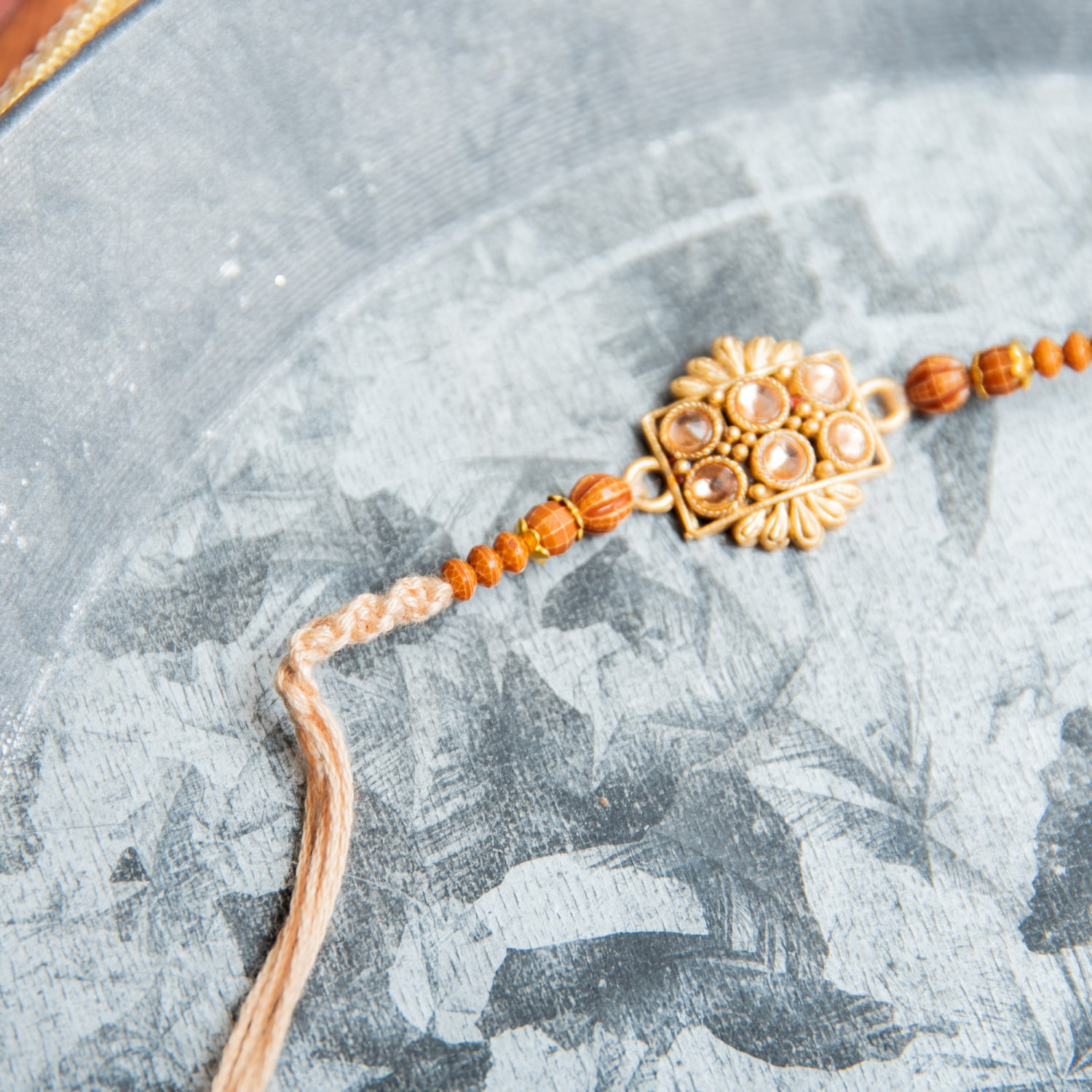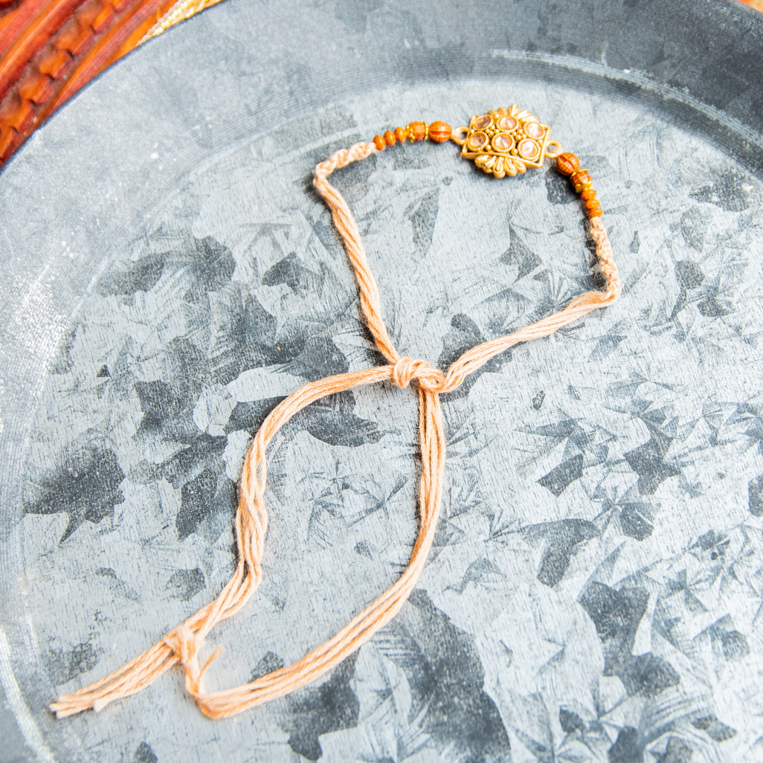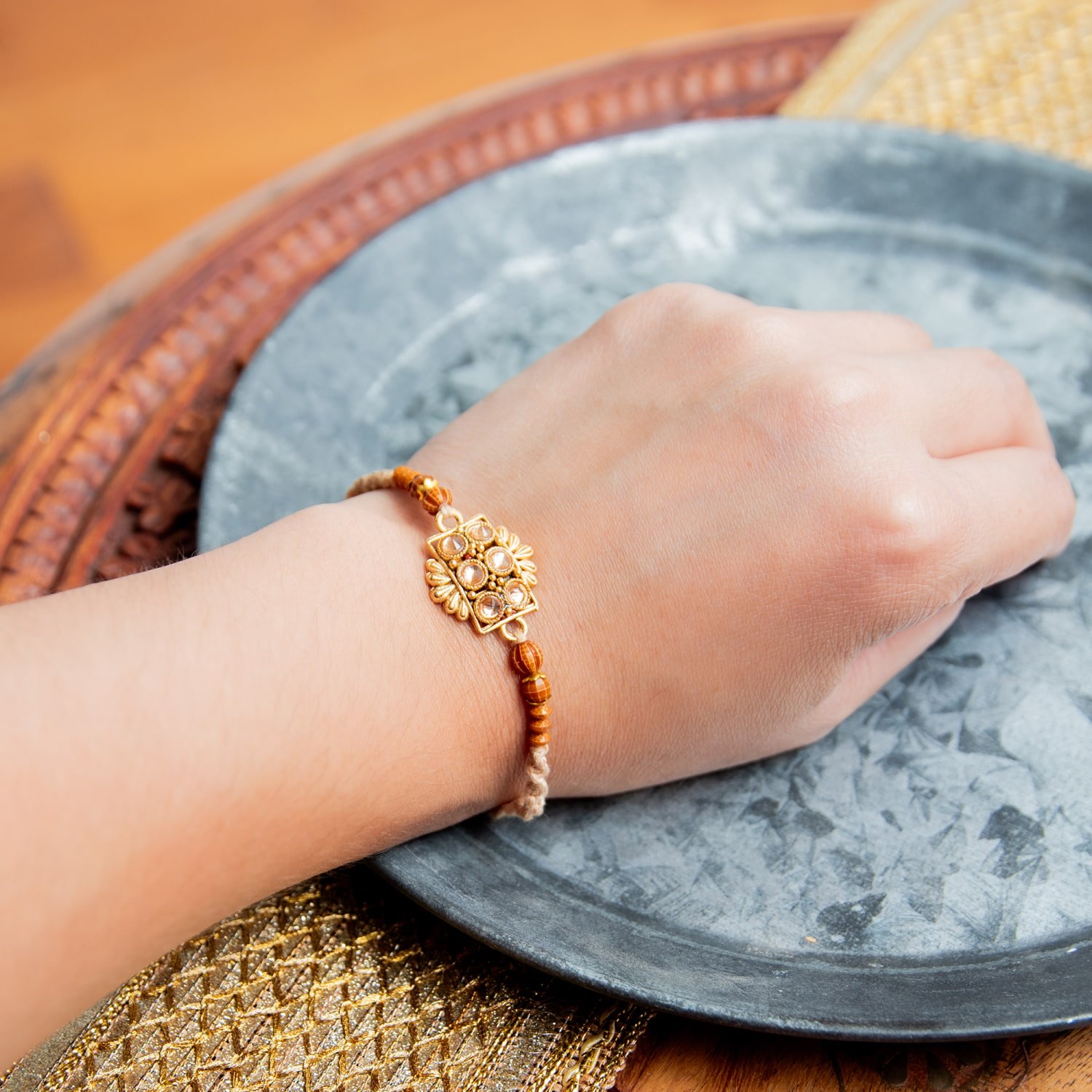 トップのモチーフにはそれぞれインドらしさが光る、素敵なデザインです。インドの伝統的なゴールドモチーフがあしらわれ、マットな輝きと繊細なデザインにはうっとりしてしまいます。兄弟の幸運を祈る幸運の意味があるブレスレット。特にラクシャー・バンダンの日でなくても、つけていると幸運がやってくるかのようです。
