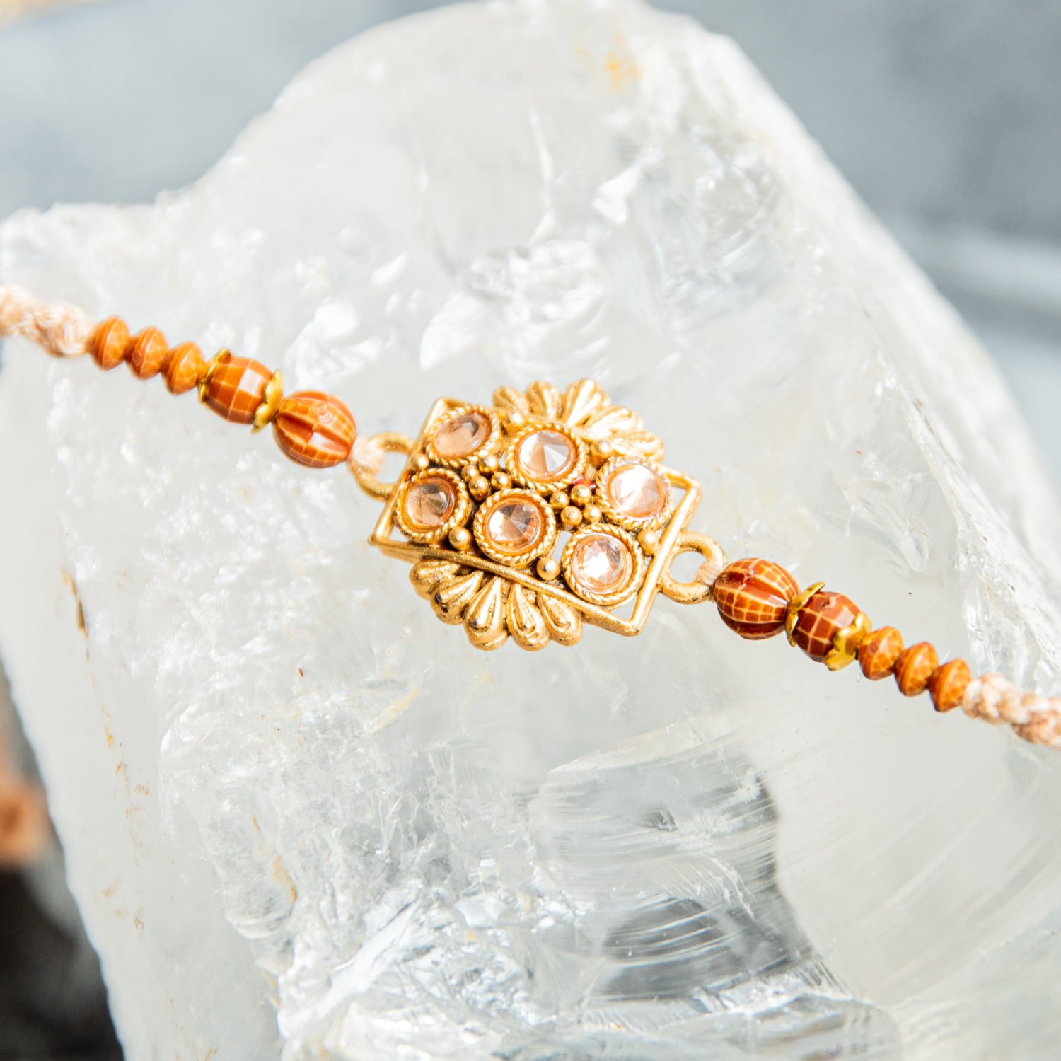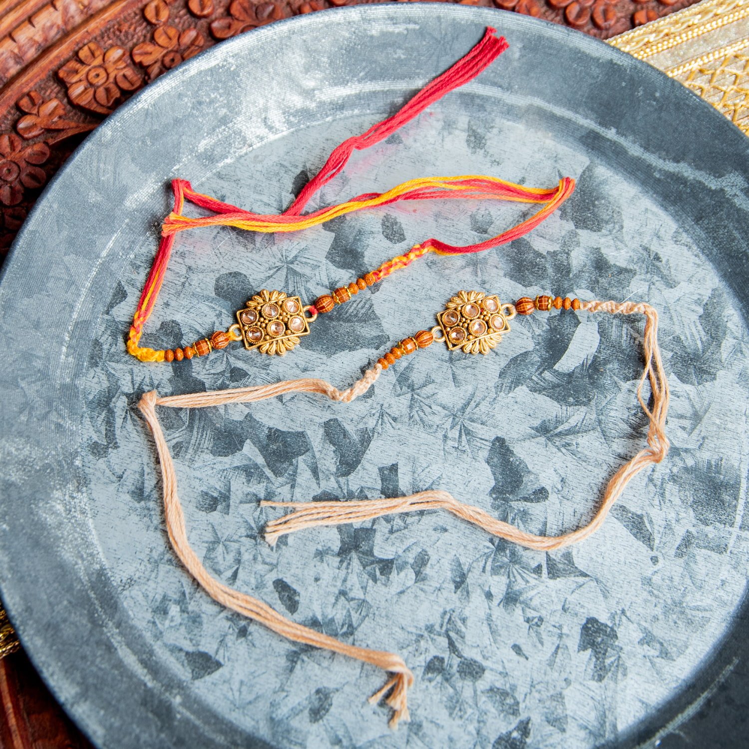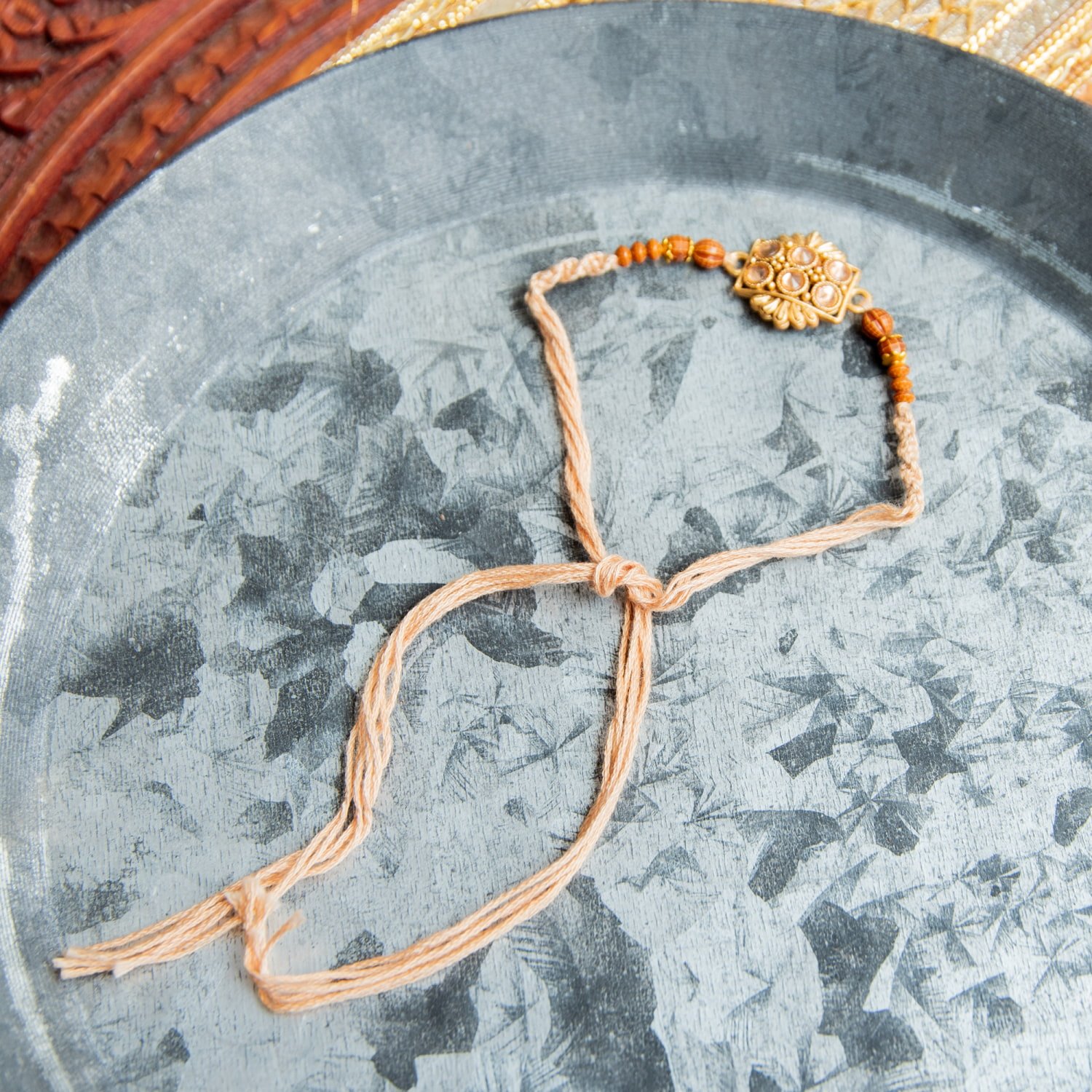 トップのモチーフにはそれぞれインドらしさが光る、素敵なデザインです。インドの伝統的なゴールドモチーフがあしらわれ、マットな輝きと繊細なデザインにはうっとりしてしまいます。兄弟の幸運を祈る幸運の意味があるブレスレット。特にラクシャー・バンダンの日でなくても、つけていると幸運がやってくるかのようです。