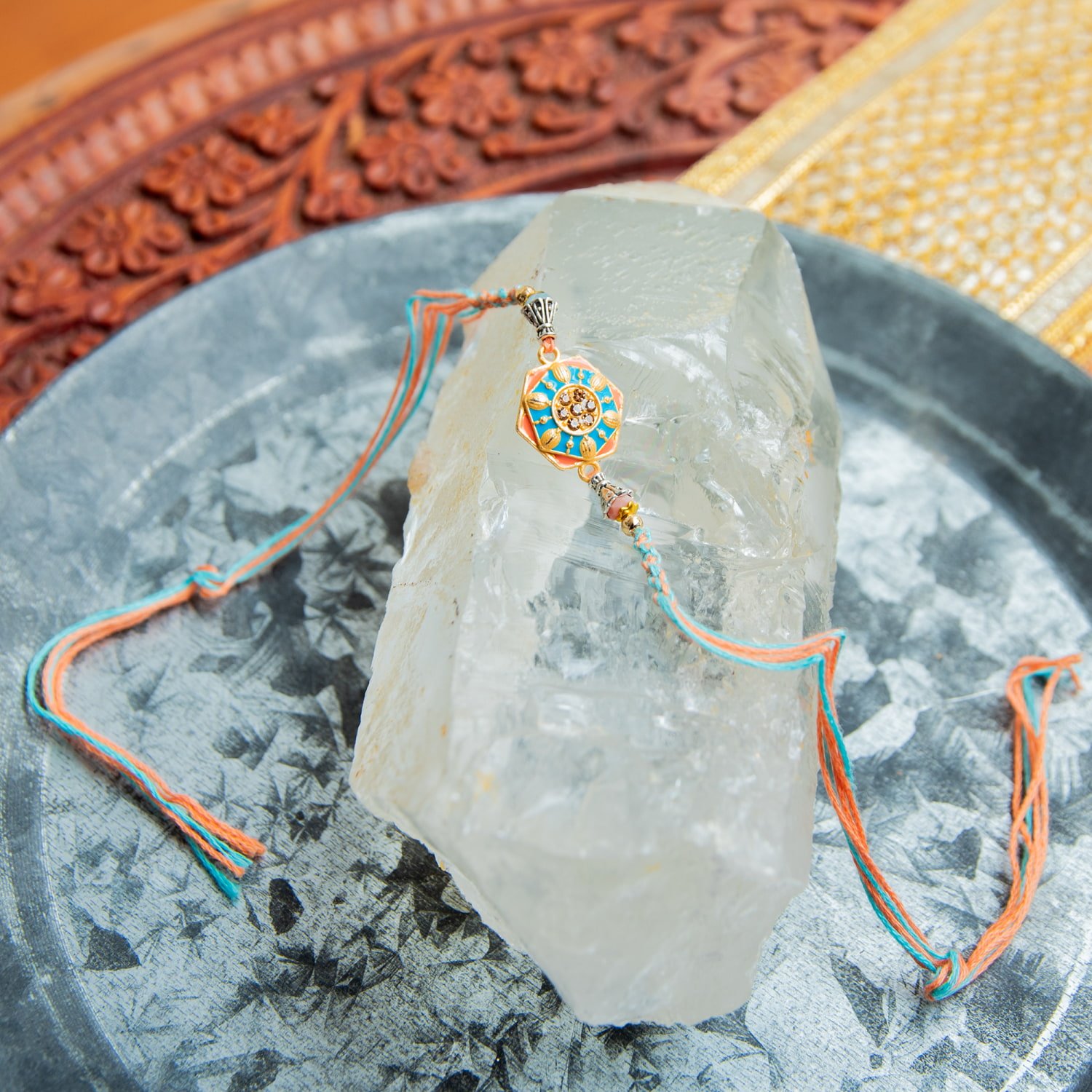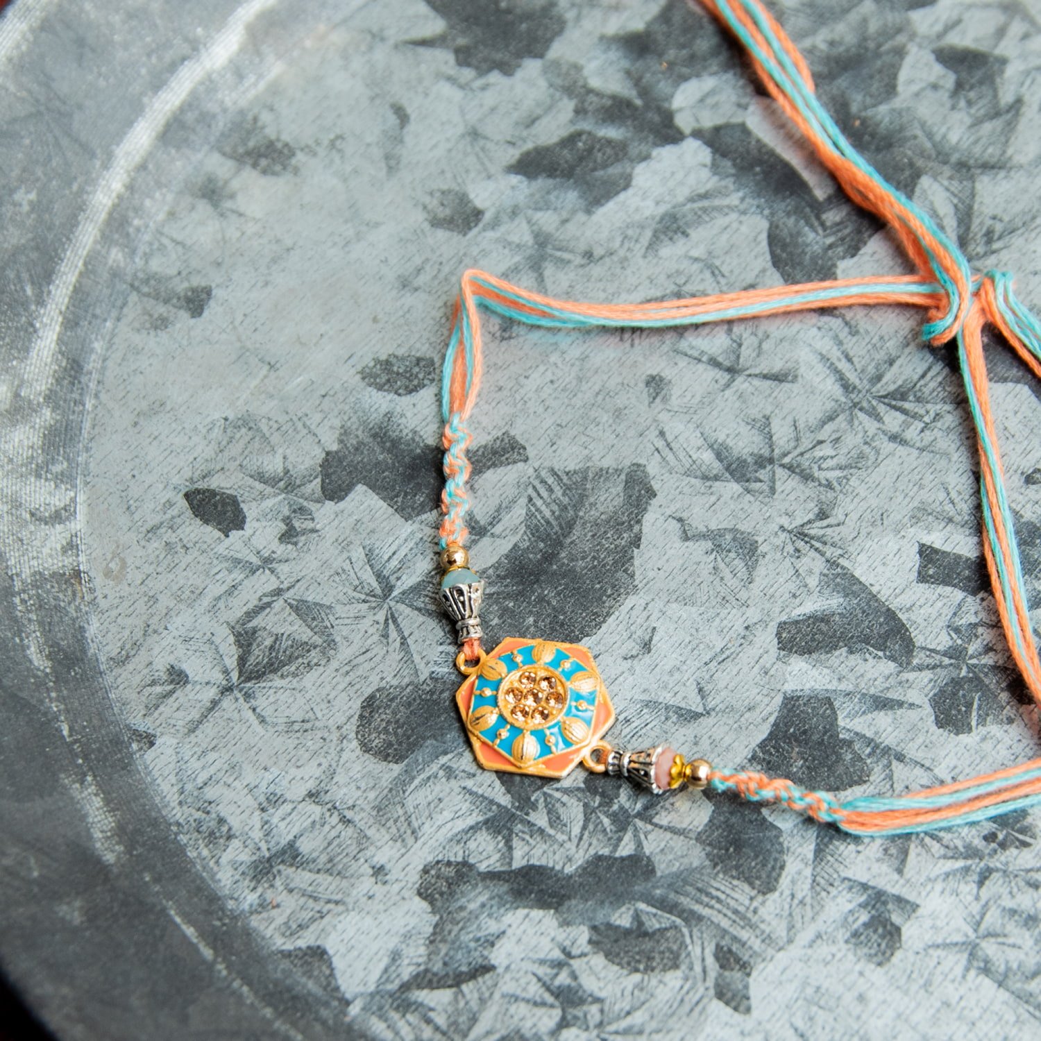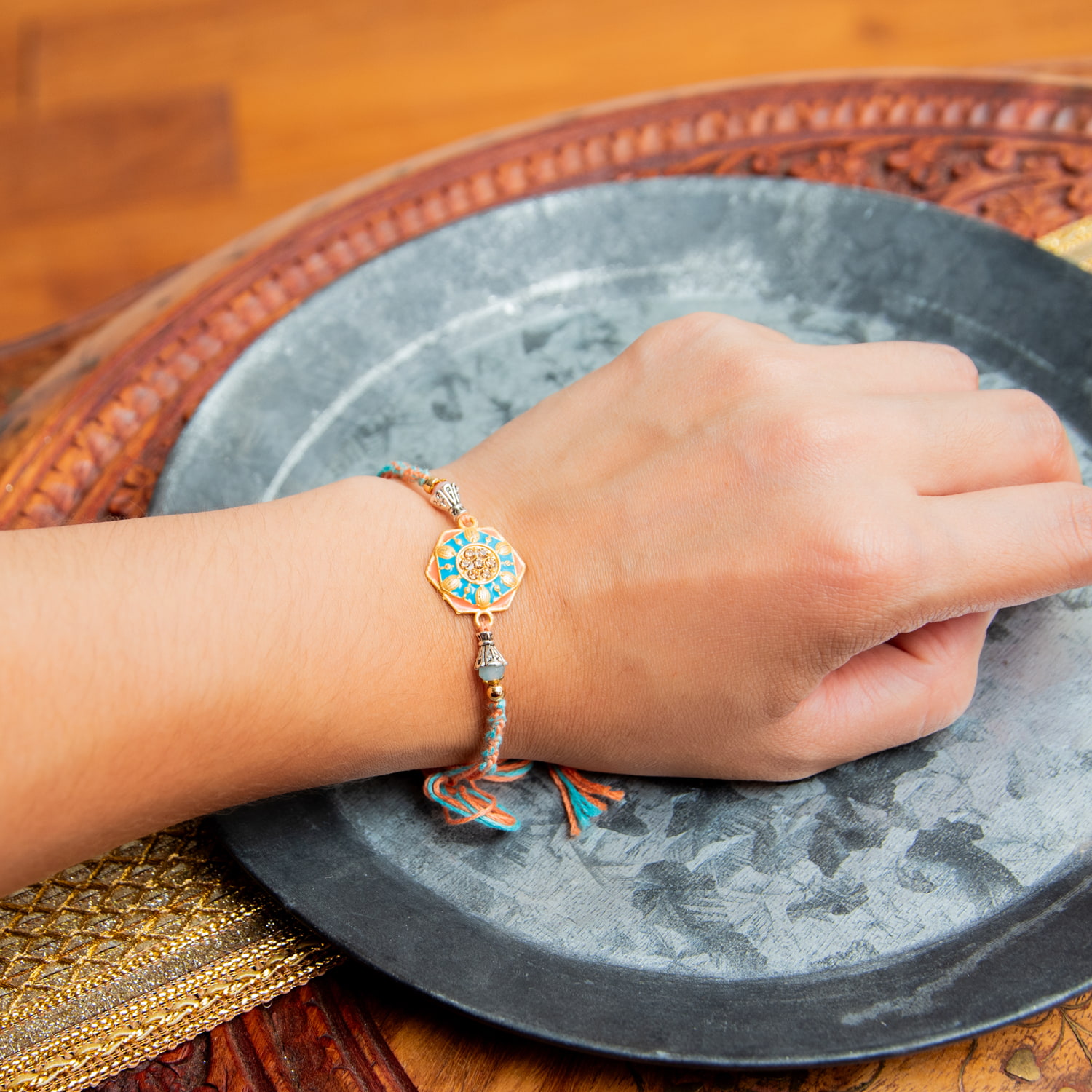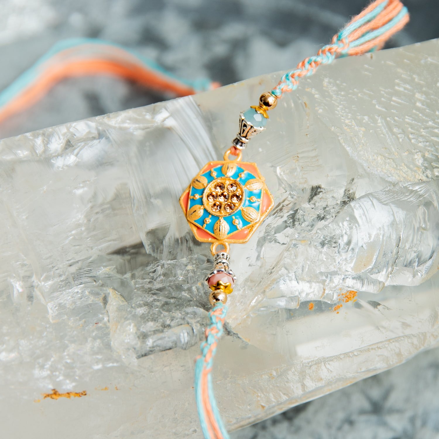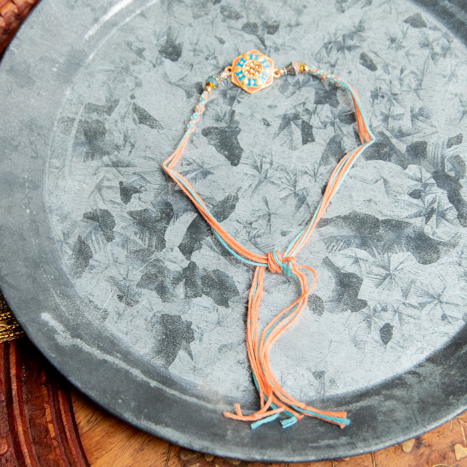 トップのモチーフにはそれぞれインドらしさが光る、素敵なデザインです。こちらは六角形のモチーフにエナメル風のデザインを施した、色鮮やかなモチーフが特徴です。紐は2種類からお選びいただけます。兄弟の幸運を祈る幸運の意味があるブレスレット。特にラクシャー・バンダンの日でなくても、つけていると幸運がやってくるかのようです。