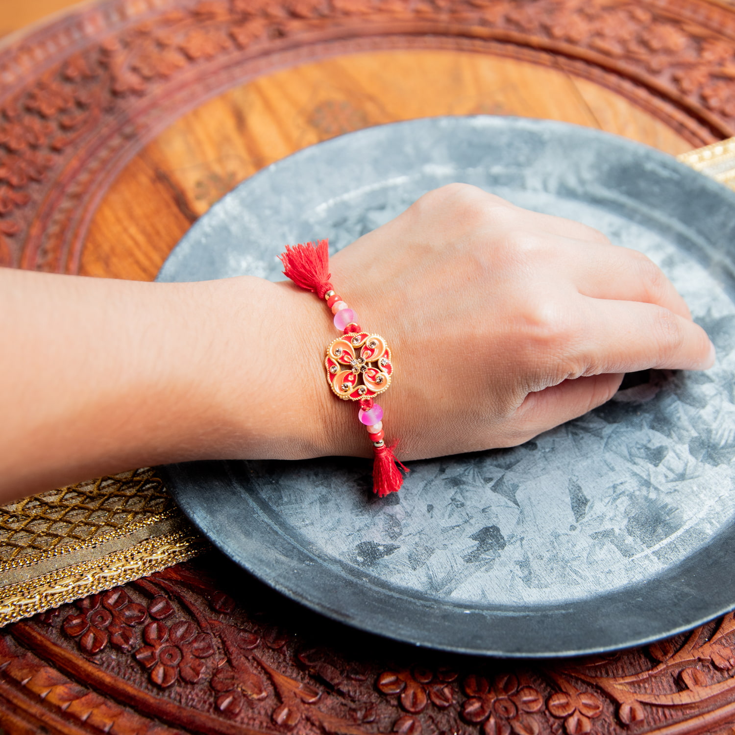 トップのモチーフにはそれぞれインドらしさが光る、素敵なデザインです。色鮮やかなスクエアモチーフの横には、ビーズやタッセルも取り付けられて華やかな雰囲気に。兄弟の幸運を祈る幸運の意味があるブレスレット。特にラクシャー・バンダンの日でなくても、つけていると幸運がやってくるかのようです。