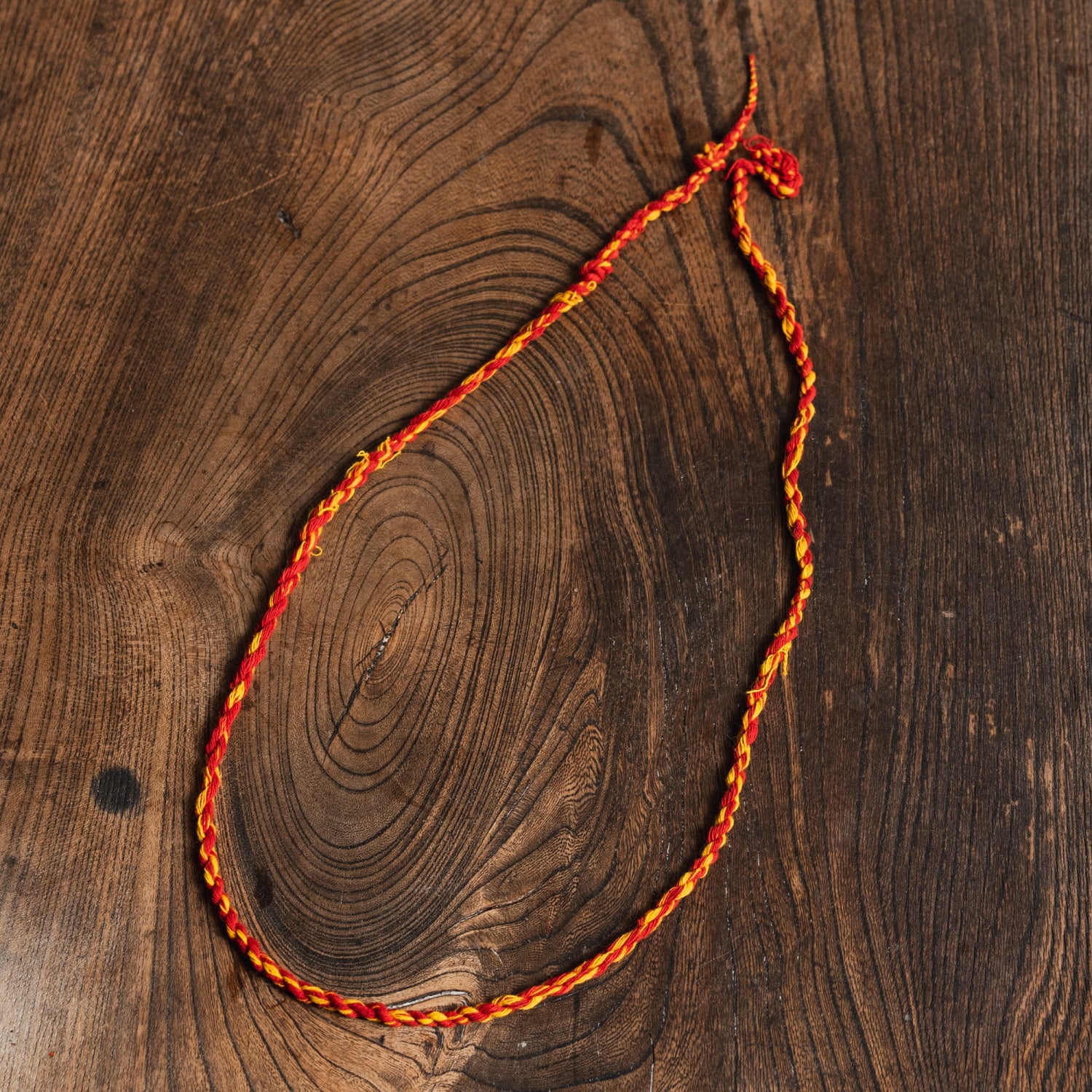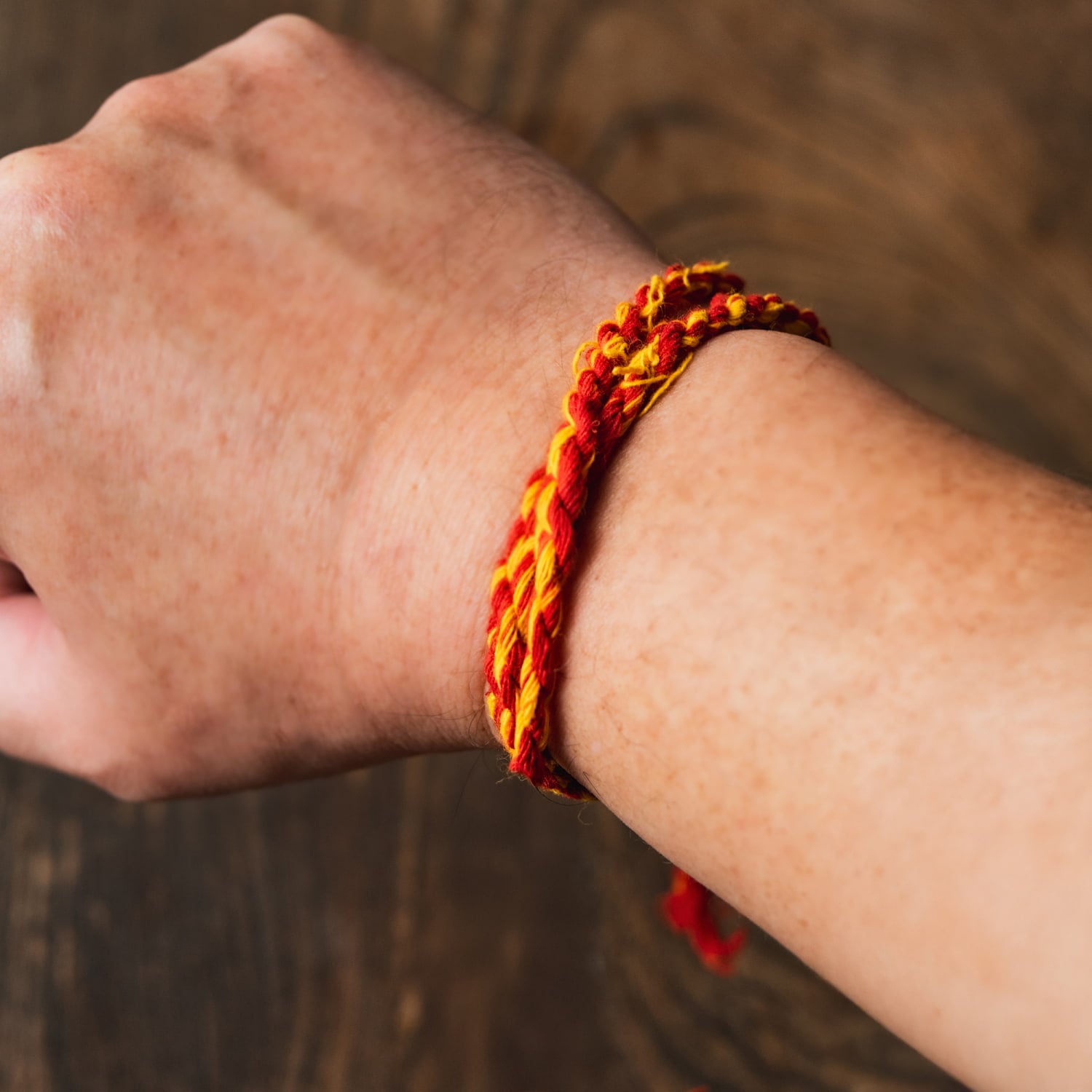 赤は長寿と厄除け、黄色は清浄さと霊的エネルギーを表します。プージャ(祈祷)や儀式の際に右手首へ結ぶことで、邪気からの保護・神々の加護・幸福や繁栄をもたらす と信じられています。