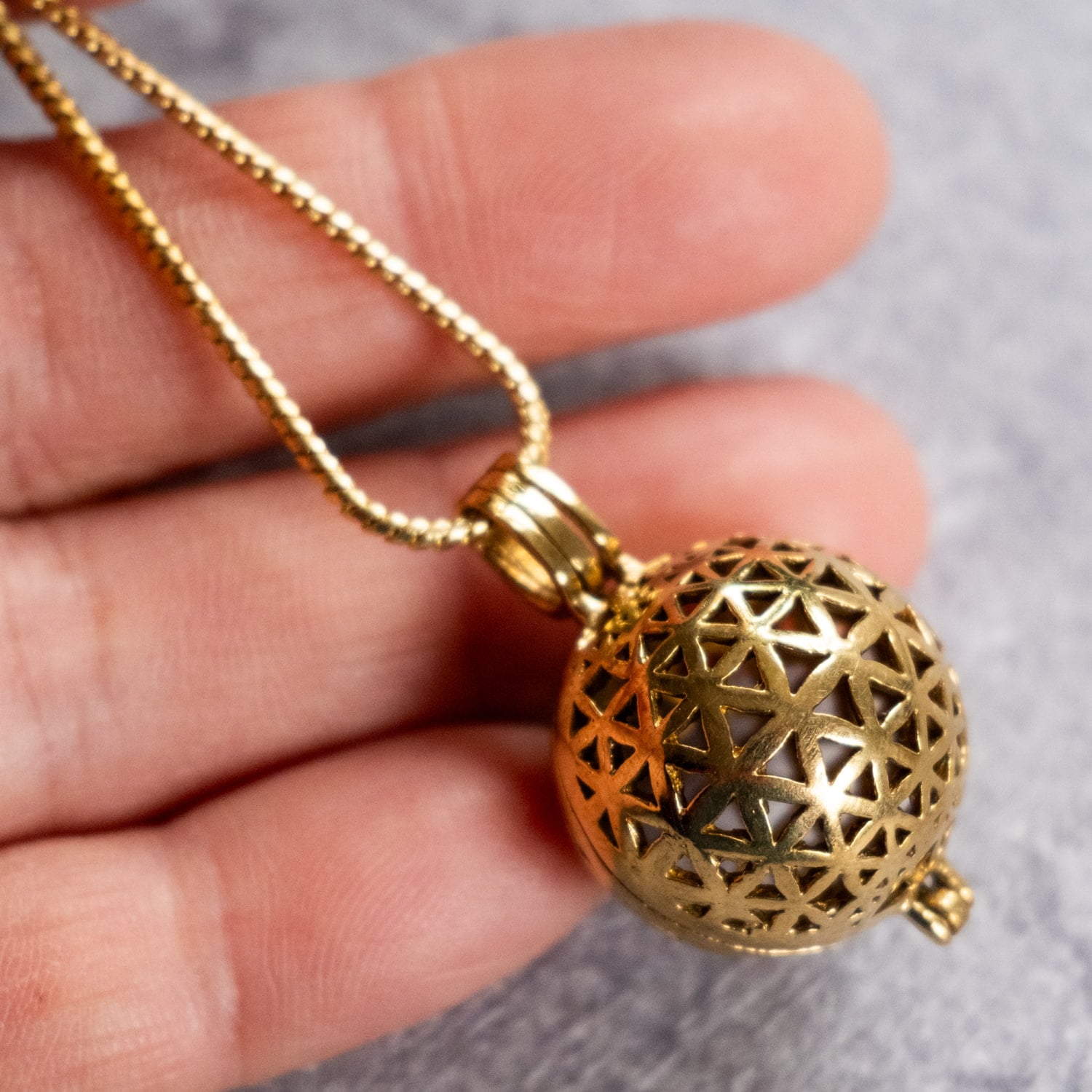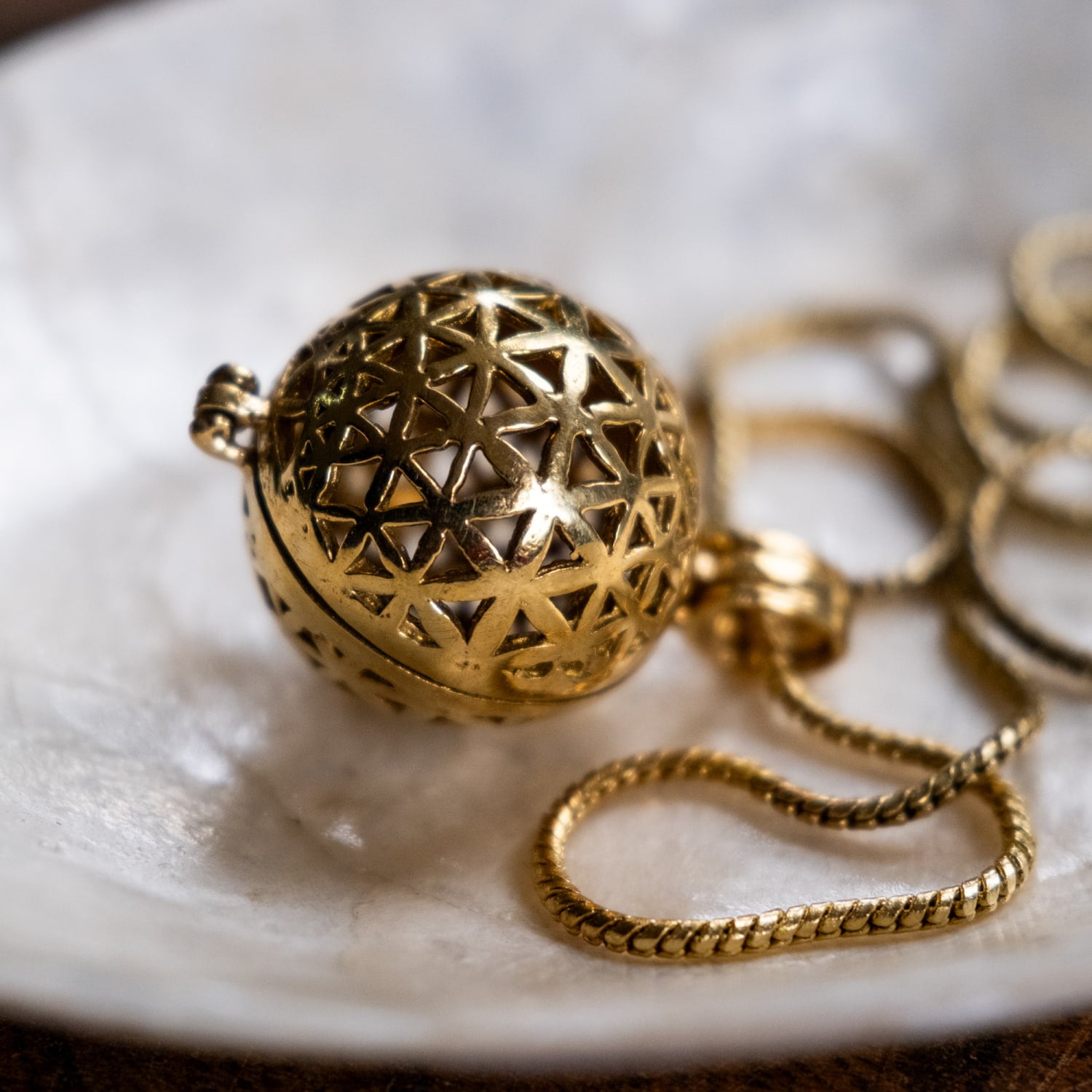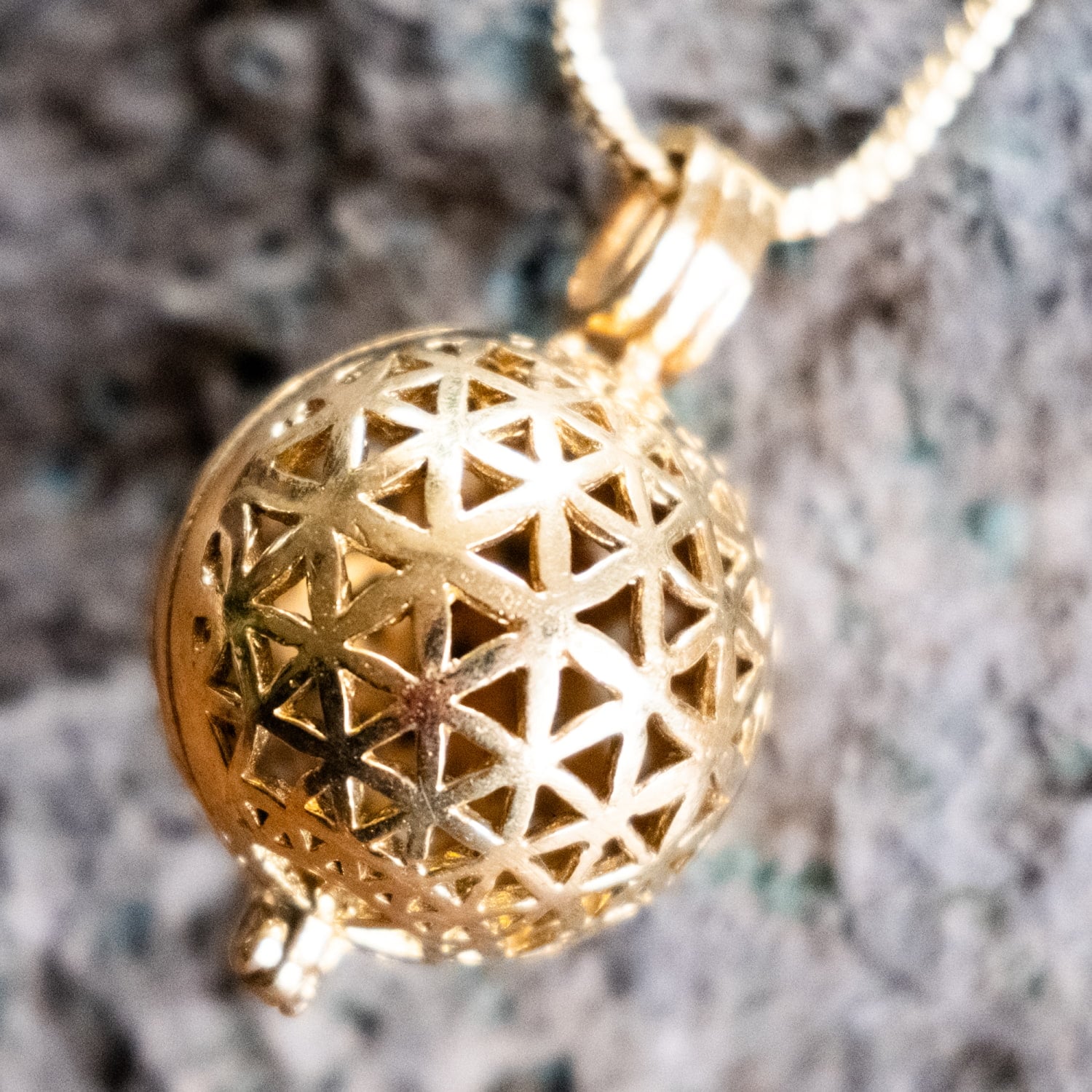 フラワーオブライフのペンダントが欲しくて探していました。こちらのガムランボールペンダントはフラワーオブライフがボールになっていて理想的でしたので購入!とてもかわいらしい音が心地よくステキです!とても満足しています。