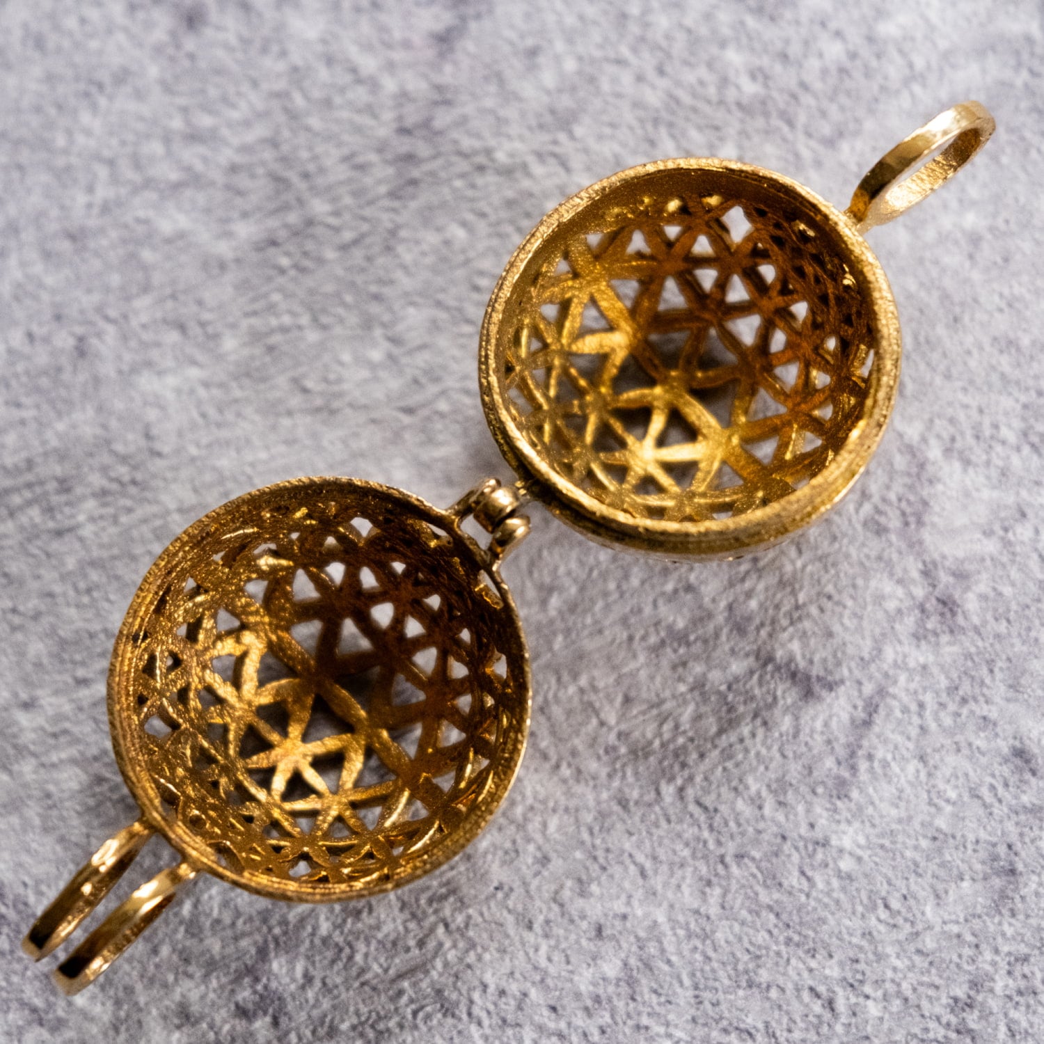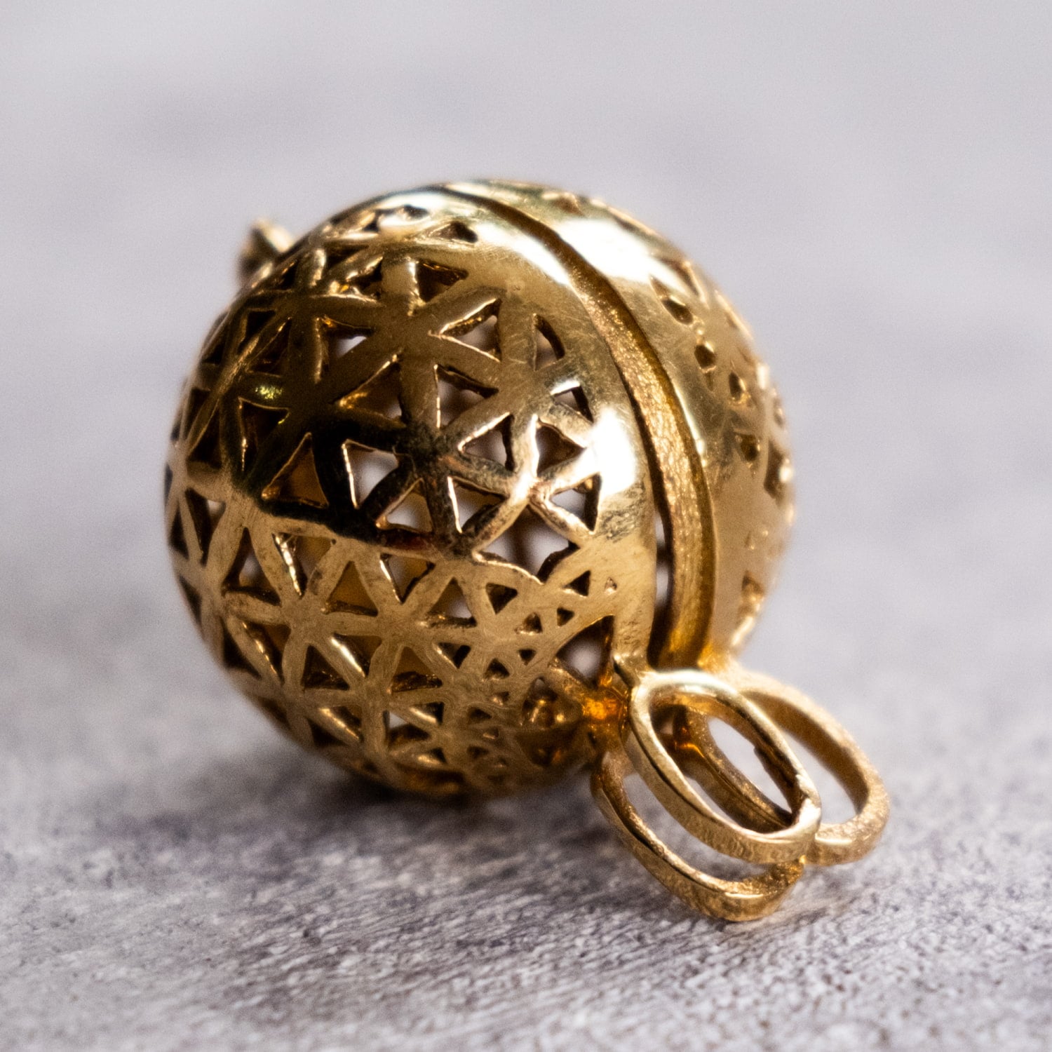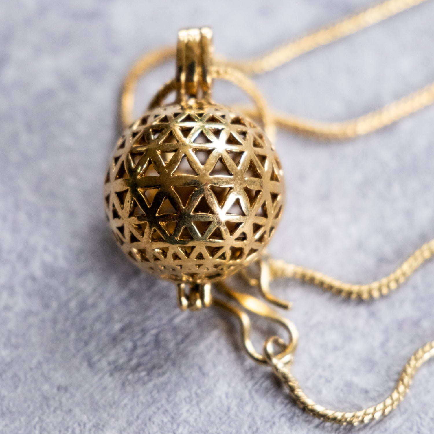 フラワーオブライフのペンダントが欲しくて探していました。こちらのガムランボールペンダントはフラワーオブライフがボールになっていて理想的でしたので購入!とてもかわいらしい音が心地よくステキです!とても満足しています。