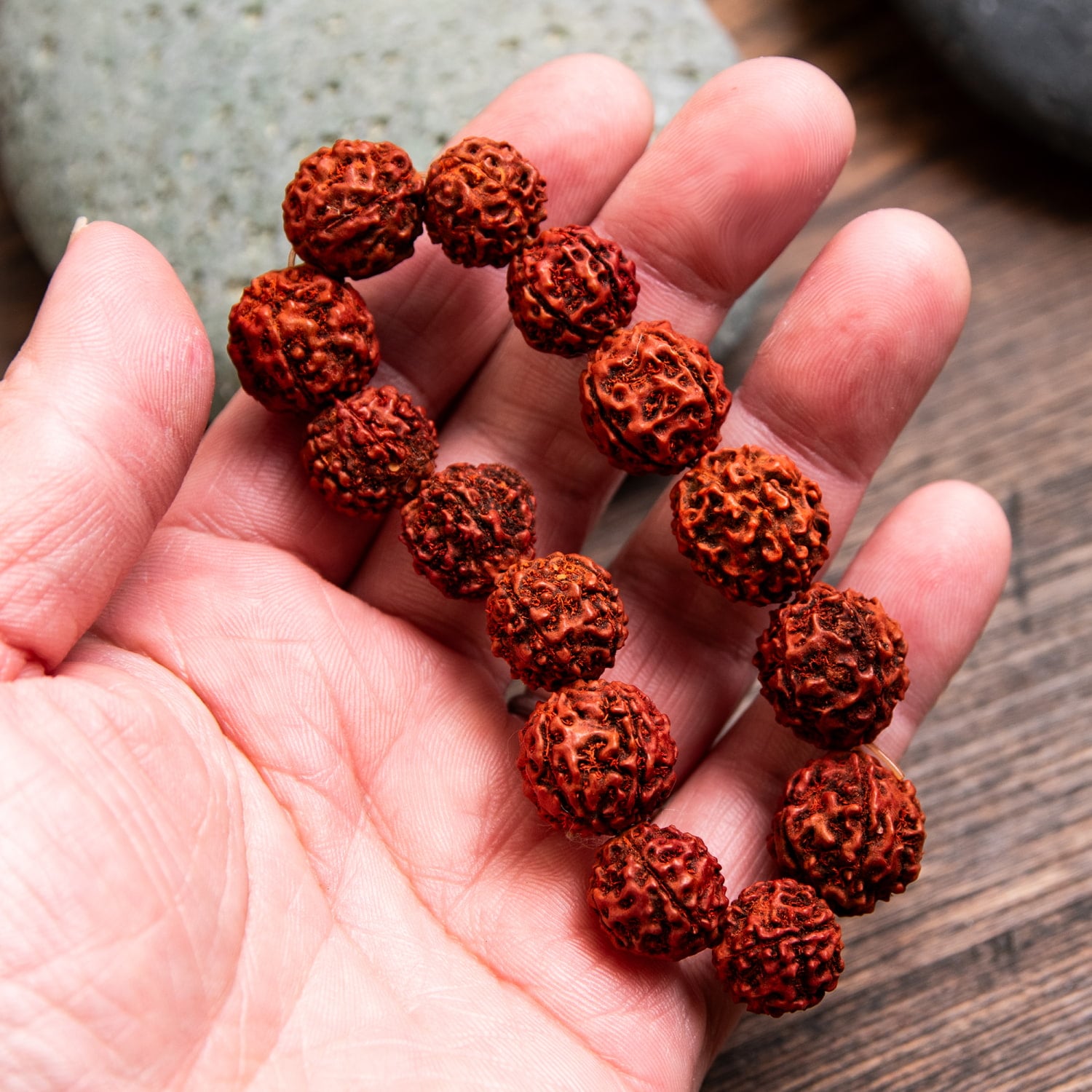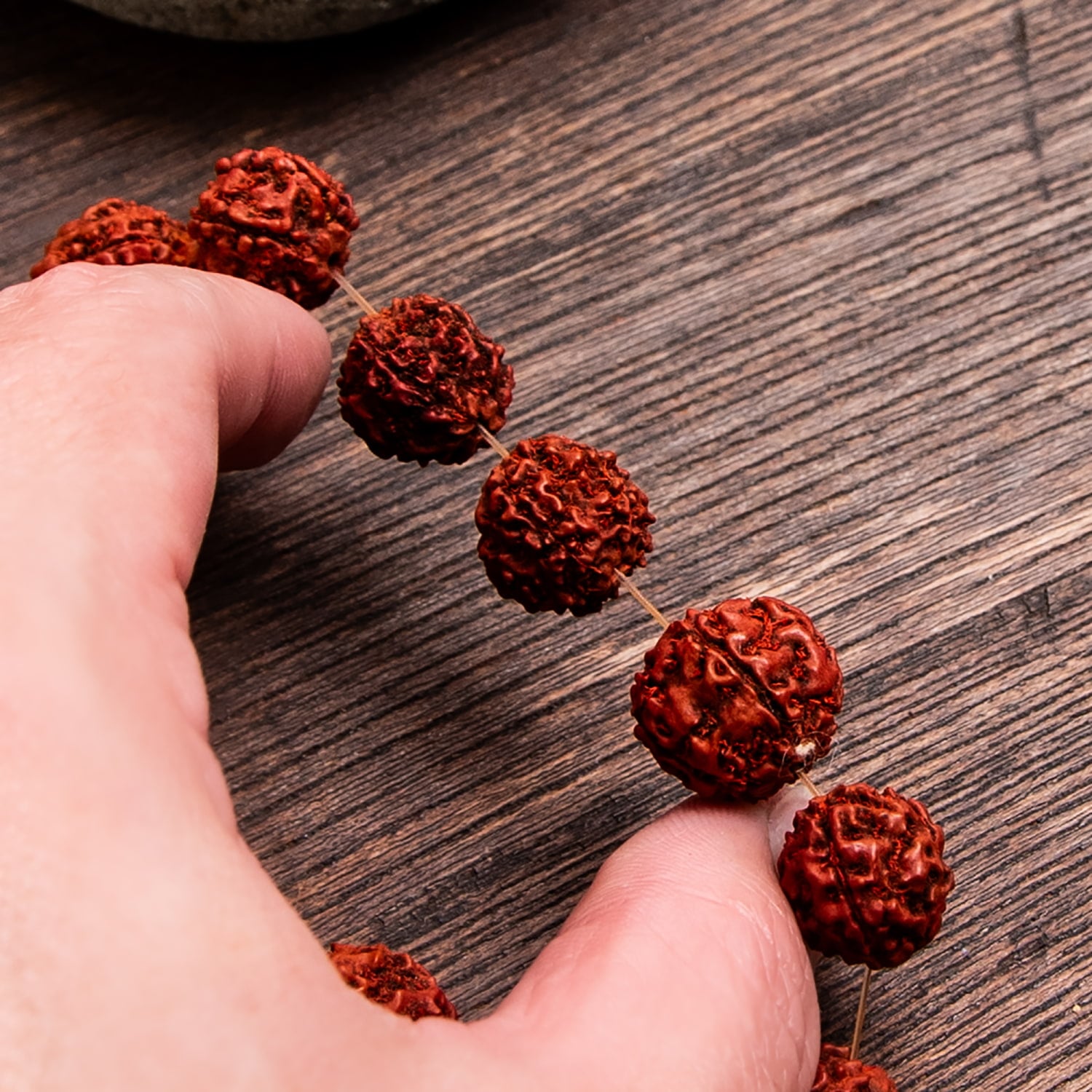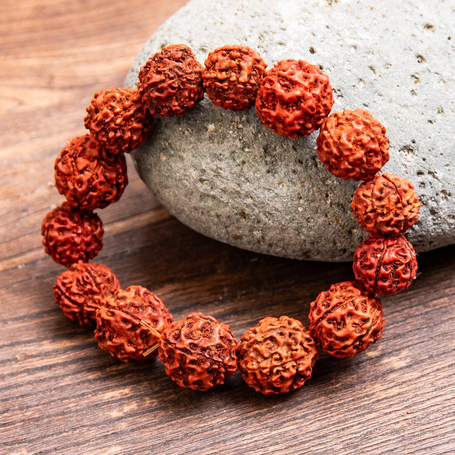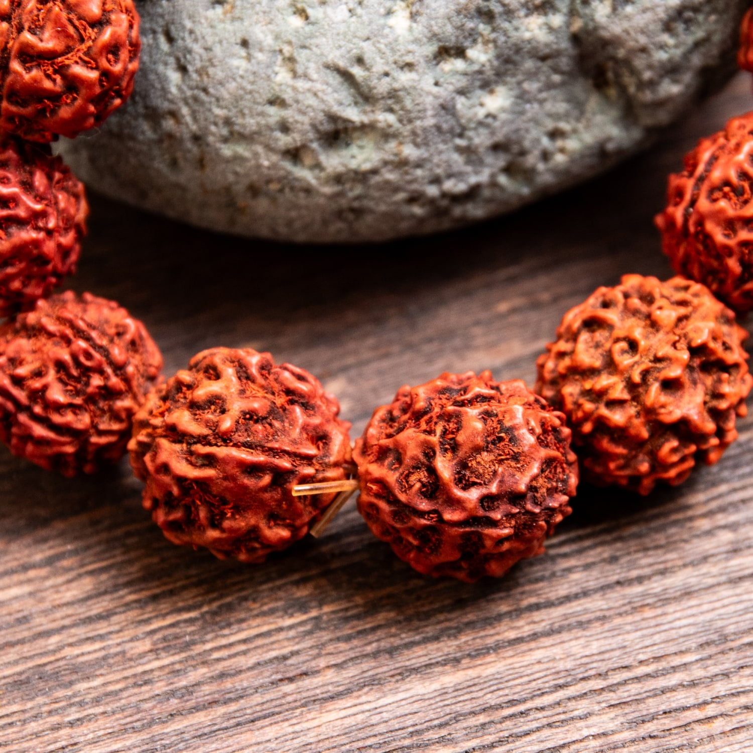 使用されているのは、ルドラクシャ(菩提樹の実)です。菩提樹の実はインドやネパール等の国において非常に神聖で霊的な力が宿っているものだと考えられているものです。面の割れ方の違いにより、いろいろな効果があるとされています。1面のルドラクシャは支配神がシヴァであり、唱えるべきマントラはOm Namah Shivayaであるとか、3面のルドラクシャは支配神がアグニであり、唱えるべきマントラはOm Kleem Namahであるとか。参考:『その名はルドラクシャ。シヴァの涙と呼ばれる不思議な木の実』