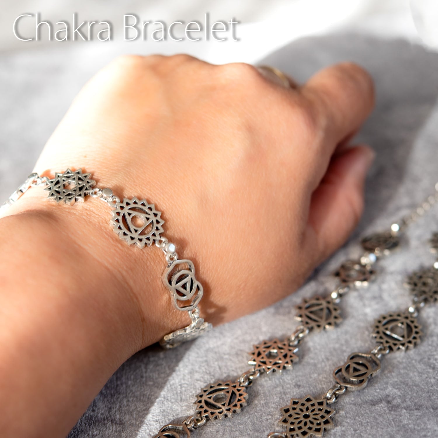 シルバーカラーのシンプルデザイン チャクラブレスレット 大です。