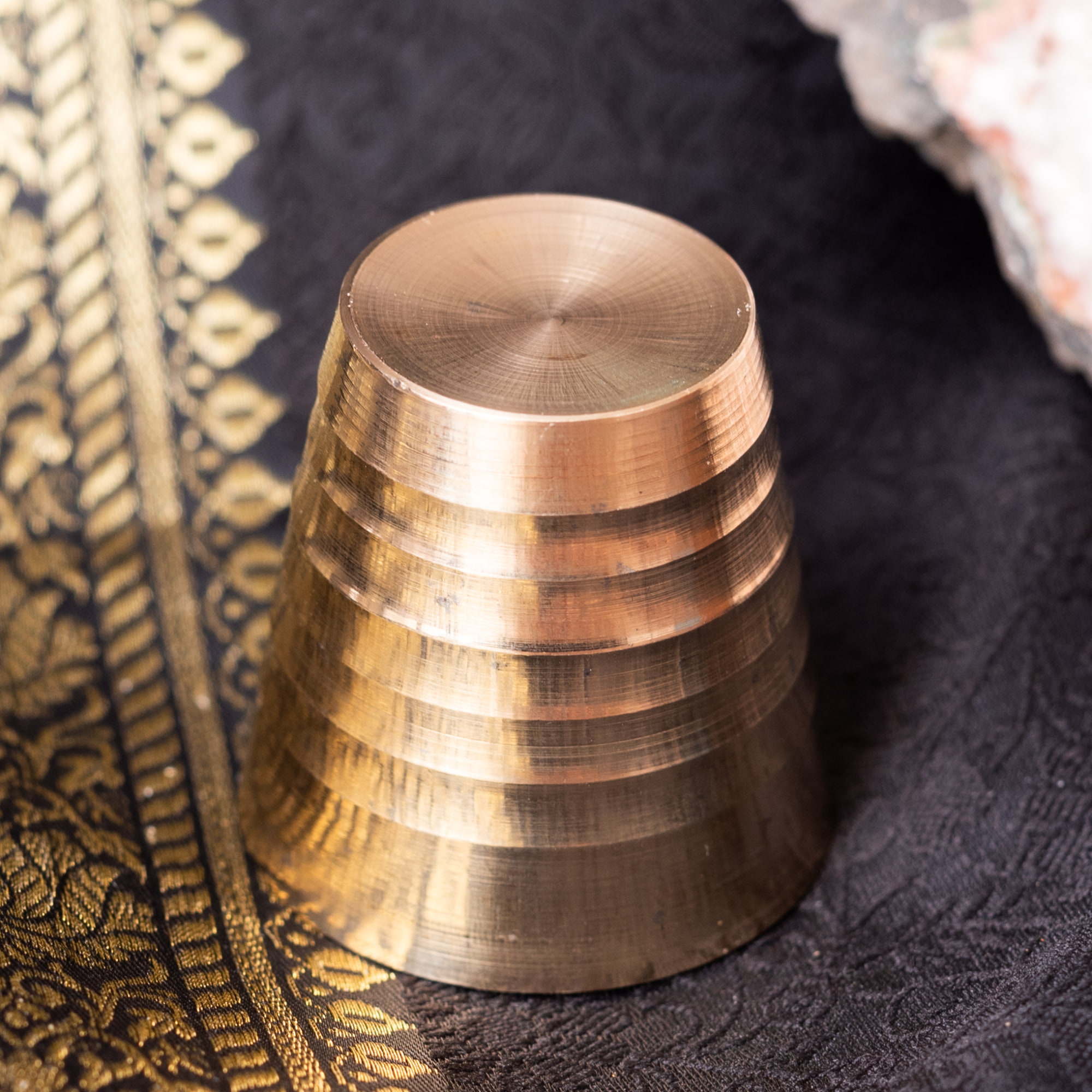 インド現地では礼拝を行う時にガンジス河の水を入れたり、神様への捧げ物の容器として主に使用されるブラスのカップです。古来よりインドではブラスは高級な金属とされ、仏像を作るのに使われたり、宗教用品にはほぼ必ず銅か、ブラスが使われてきました。手のひらに収まる小ぶりな、かわいらしいサイズ感のブラスカップ。模様として入っている横ラインは持つときの滑り止めにもなり、見た目の美しさと実用性を兼ねています。