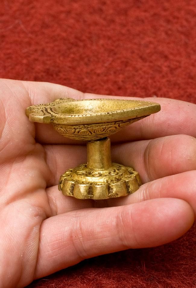 ブラス製のオイルランプ(&お香立て)です。インドではブラスは穢れがつきづらいと考えられていて、神様の像の素材としても多く使用されています。オイルランプとして使用する時は、コットンをひねって灯心にします。燃料はサラダ油などの食用油で大丈夫です。灯心は当店でもお取り扱いがございます。