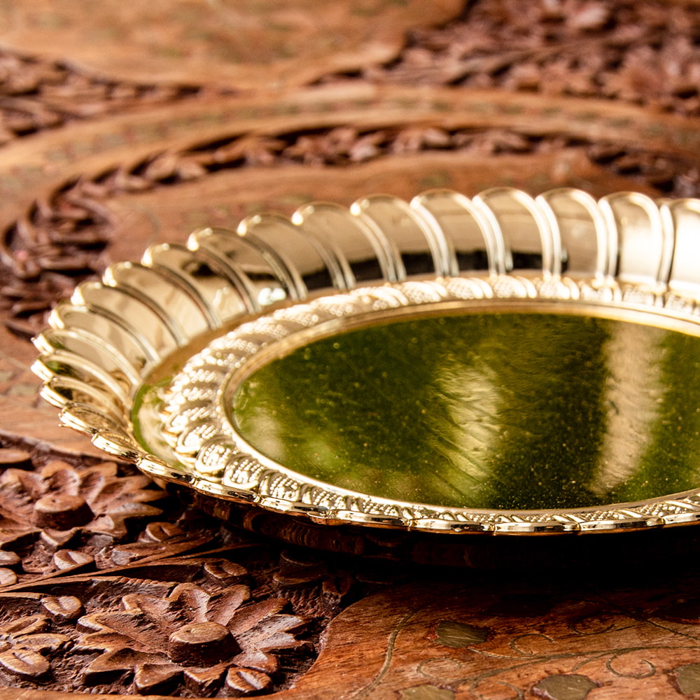 礼拝や、神様へのお供物を供する際に用いられる礼拝皿です。余分な装飾を排したスッキリとしたフォルムは、インテリアにもおすすめの存在感のあるお皿ですね。インド現地ではガネーシャの大好物モーダカというお菓子をお供えしていたり、ガンジス河の水をいれていたりします。祭壇用の装飾器具や身の回りをエスニックに飾るのにお楽しみください。