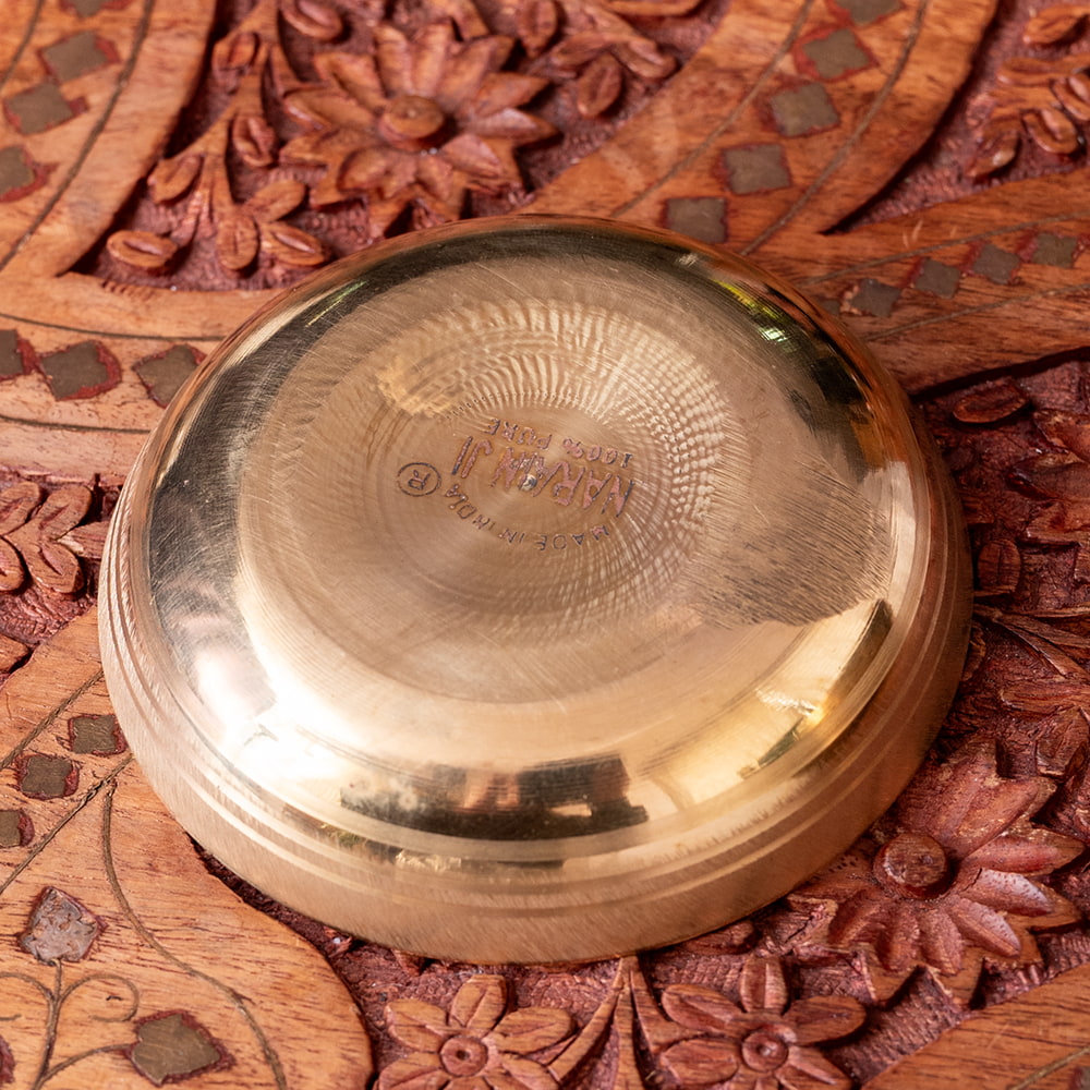 こちらはインドのプージャ(祈りの儀式)や、祭壇で使われているブラス製の小皿です。直径約9.5cm、縁の高さ約2cmのほどよいサイズ感で、神様への捧げ物やお香の他、灯心を入れればオイルランプのようにも使うことができます。表面は艷やかな鏡面加工が施され、滑らかな輝きが特徴。施された鏡面加工によって、周囲のオイルランプの明かりやキャンドルの灯りを映し出し、神秘的な美しさを引き立てます。光が反射することで、空間を彩り特別な雰囲気に。