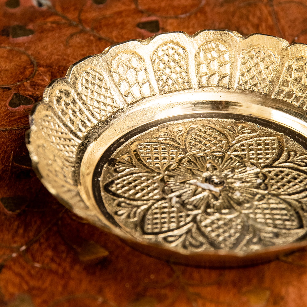 礼拝や、神様へのお供物を供する際に用いられるブラスの小皿です。中心には花が描かれ、周囲はまるでヒンドゥ建築の格子窓のような彫り込みがされており、それ自体が一つの寺院のような美しい小皿です。■確かな存在感と神秘的なフォルム