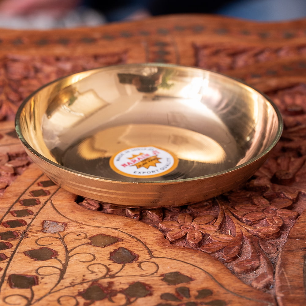 こちらはインドのプージャ(祈りの儀式)や、祭壇で使われているブラス製の小皿です。直径約9.5cm、縁の高さ約2cmのほどよいサイズ感で、神様への捧げ物やお香の他、灯心を入れればオイルランプのようにも使うことができます。表面は艷やかな鏡面加工が施され、滑らかな輝きが特徴。施された鏡面加工によって、周囲のオイルランプの明かりやキャンドルの灯りを映し出し、神秘的な美しさを引き立てます。光が反射することで、空間を彩り特別な雰囲気に。