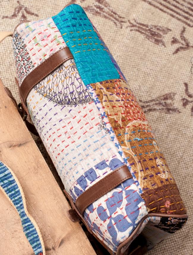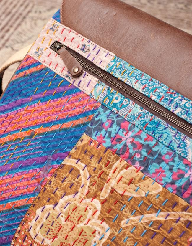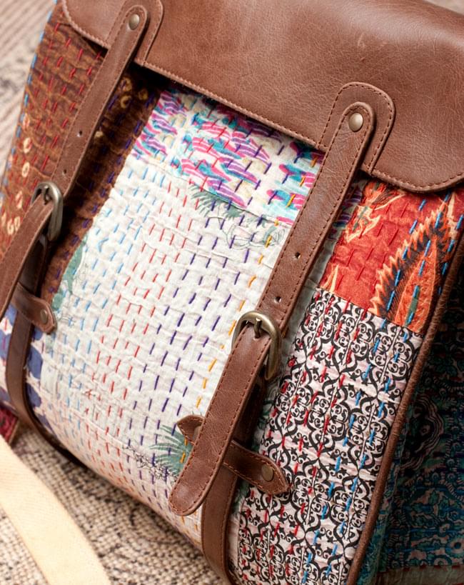 こちらのバッグに使用されているラリーキルト(カンタ刺繍)は、インド西部やパキスタンのシンド州などの周辺地域で、昔から伝統的に作られているキルトです。オールドコットンサリーなどの布を、小さく四角に切り出して、それを刺し子で縫い合わせ、パッチワークの布を作り上げます。