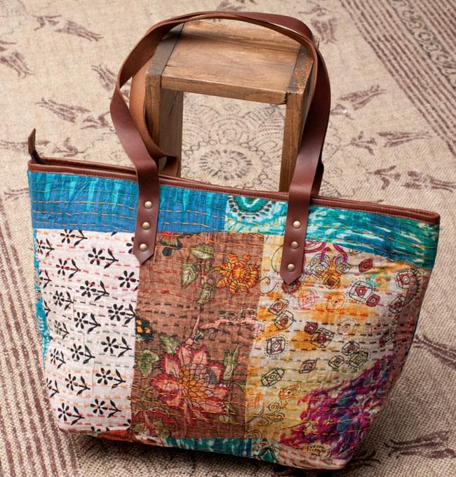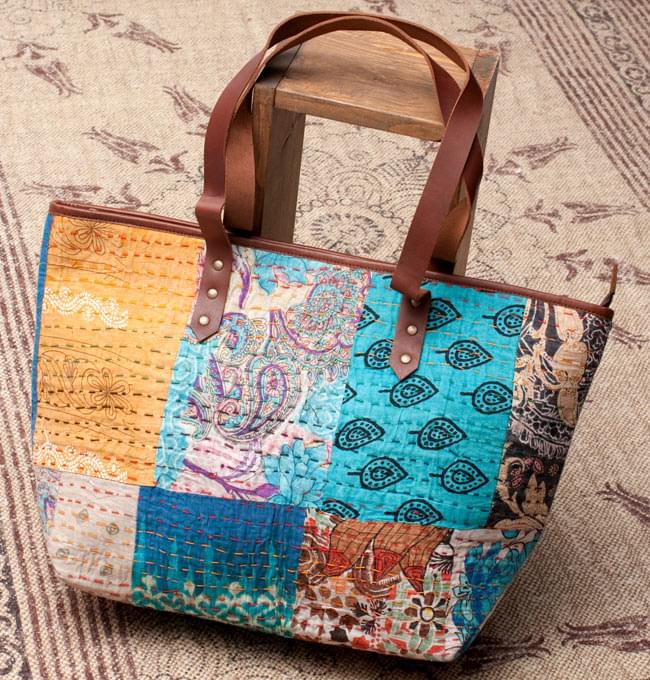 お送りする商品はこちら。とっても作りの良い一点物のトートバッグです。ラリーキルトを繋ぎあわせて一品づつ丁寧に手作りしてあります。