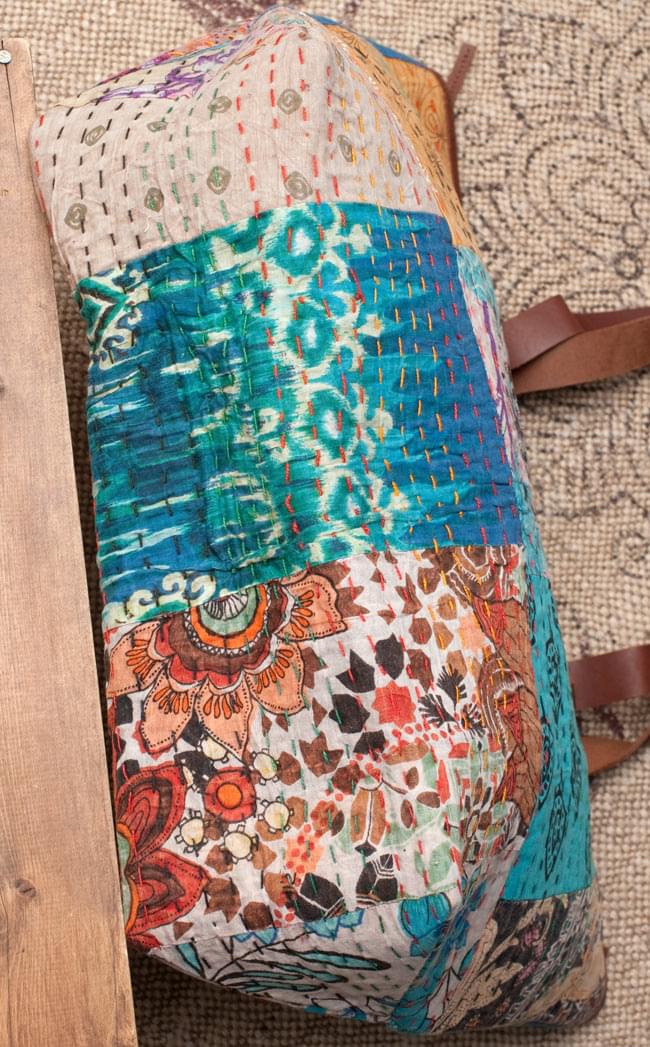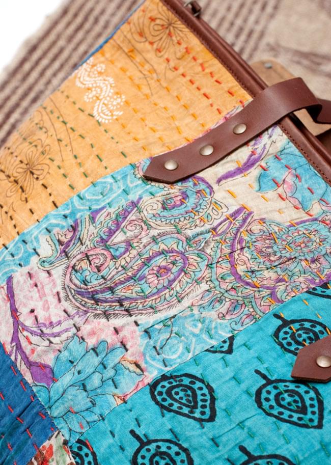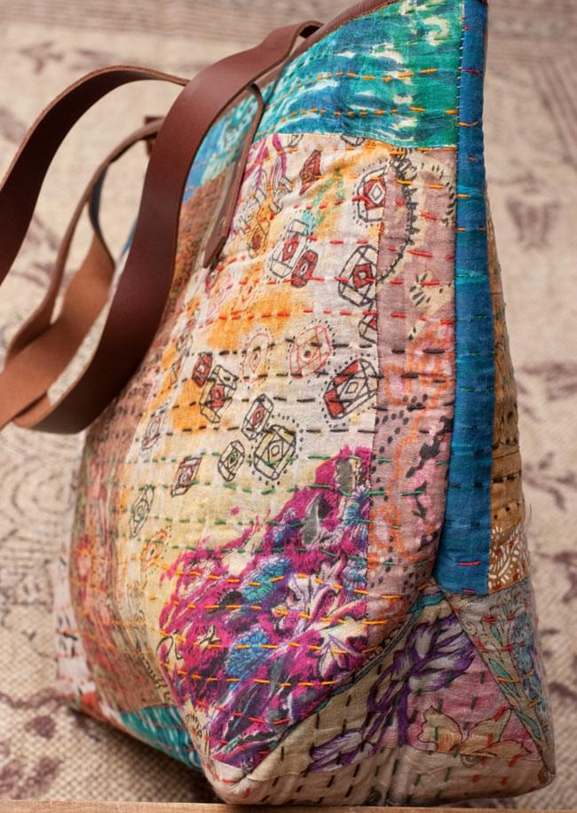 こちらのバッグに使用されているラリーキルト(カンタ刺繍)は、インド西部やパキスタンのシンド州などの周辺地域で、昔から伝統的に作られているキルトです。オールドコットンサリーなどの布を、小さく四角に切り出して、それを刺し子で縫い合わせ、パッチワークの布を作り上げます。