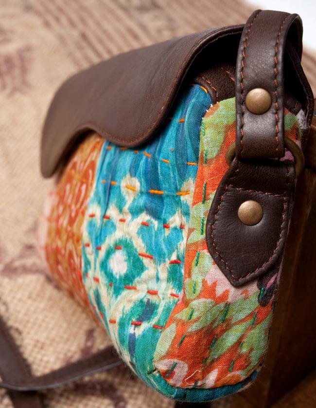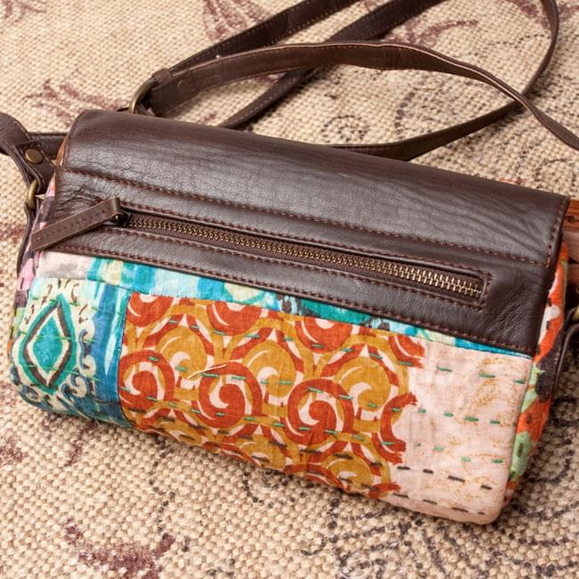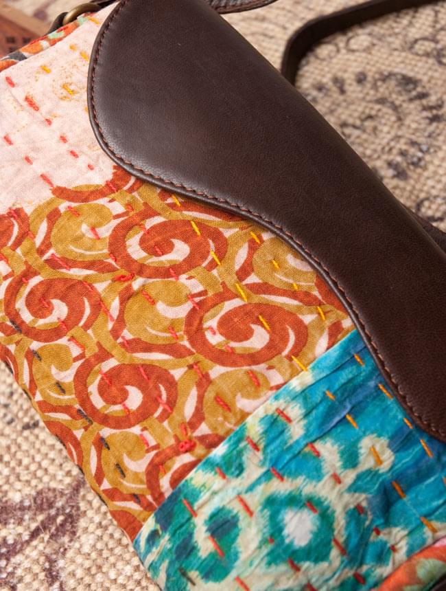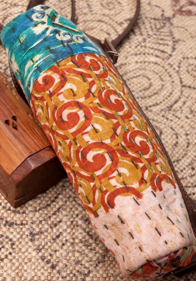 こちらのバッグに使用されているラリーキルト(カンタ刺繍)は、インド西部やパキスタンのシンド州などの周辺地域で、昔から伝統的に作られているキルトです。オールドコットンサリーなどの布を、小さく四角に切り出して、それを刺し子で縫い合わせ、パッチワークの布を作り上げます。