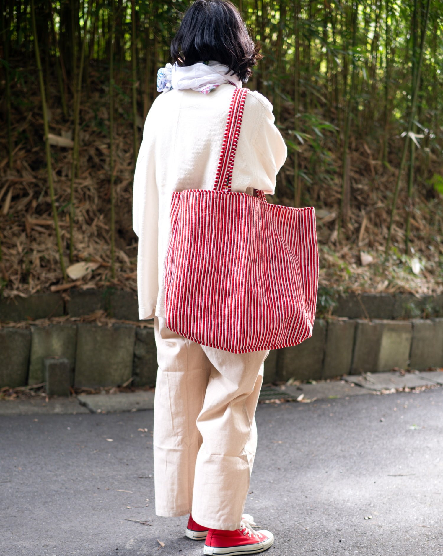 カラフルな色合いが目を引く、大容量のコットンバッグ!鮮やかな色合と大きなプリント柄が特徴的な大きなトートバッグです。このプリント柄、インドでは大流行のようで、至るところに出現していました。いつもは流行をあまり追わないティラキタ買付班ですが、あまりの可愛さに限定的に仕入れてみました。