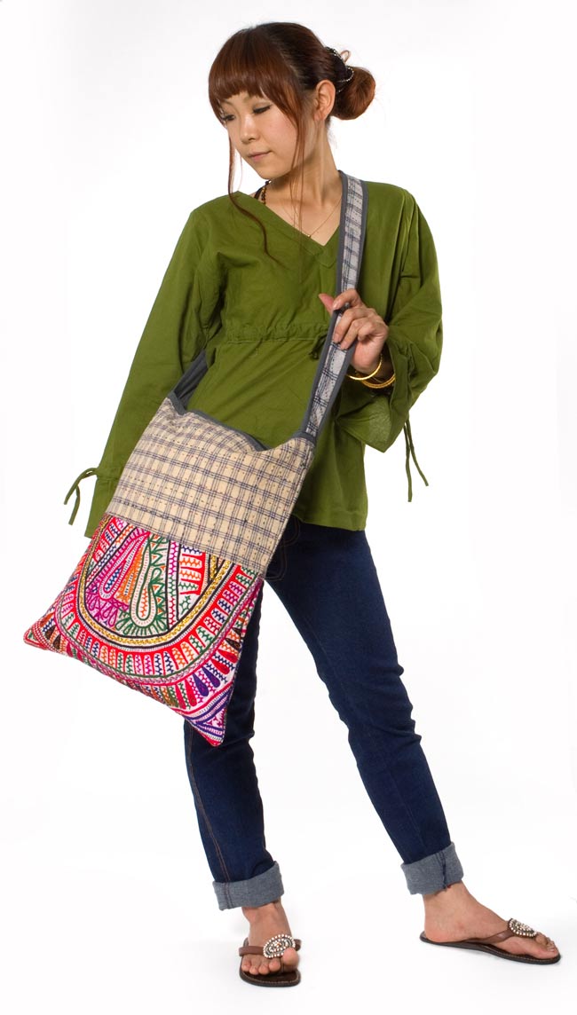 グジャラート州のカッチ(Kutch)地方でつくられた刺繍織物を使ったバッグです。古くはマハラジャへの献上品としても喜ばれたというだけあって、繊細で濃密な刺繍は美術品のような美しさ。ラバリ族の女性たちの手によって、一つ一つ丁寧に製作されています。