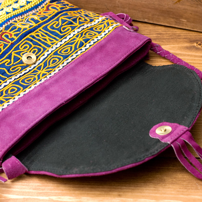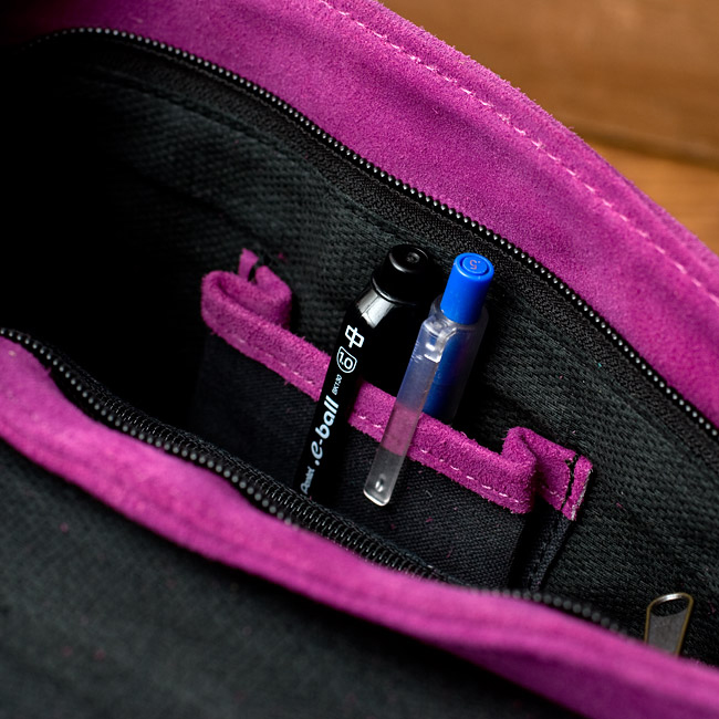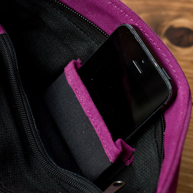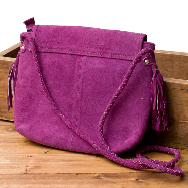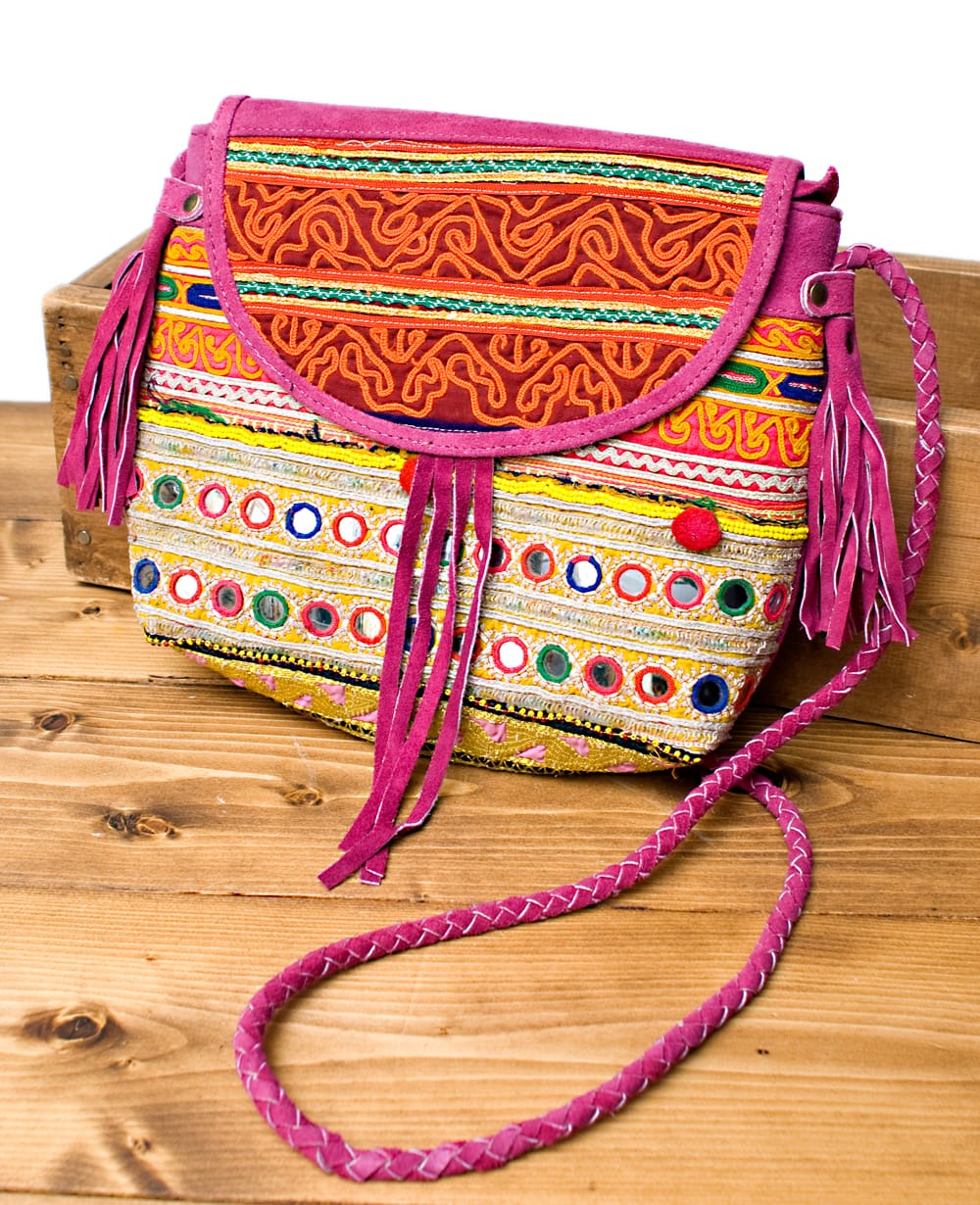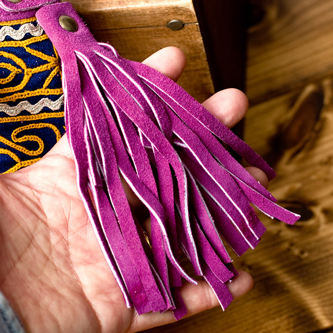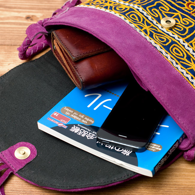 しっかりとしたスウェードのレザー生地に色鮮やかな美しい刺繍が印象的なバッグです。小さ過ぎず、大き過ぎず、肩からかけるショルダータイプのデザインにぴったりのサイズ感で、小さめの冊子、長財布、携帯電話が問題なく入ります。■世界に一つだけの特別感