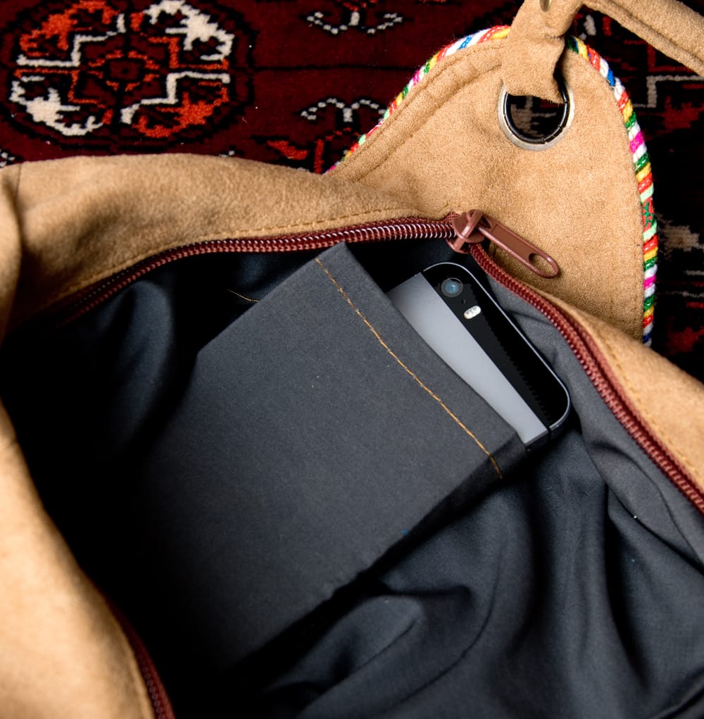 写真でご覧いただけます通り、日常使いには十分な収納力があります。内部の側面にも、携帯などの小物をいれるための小物収納がしっかりと付いていて、荷物を綺麗に分けておくことができます。■山岳民族のモン族