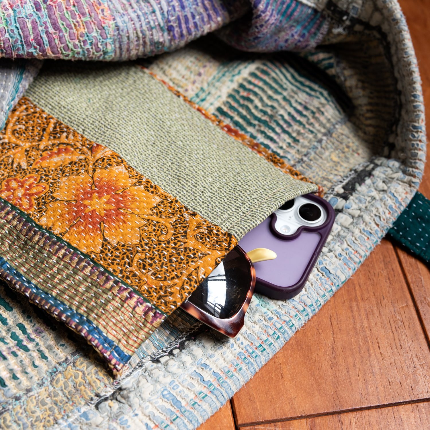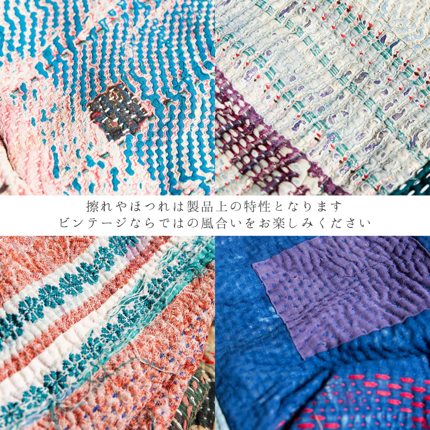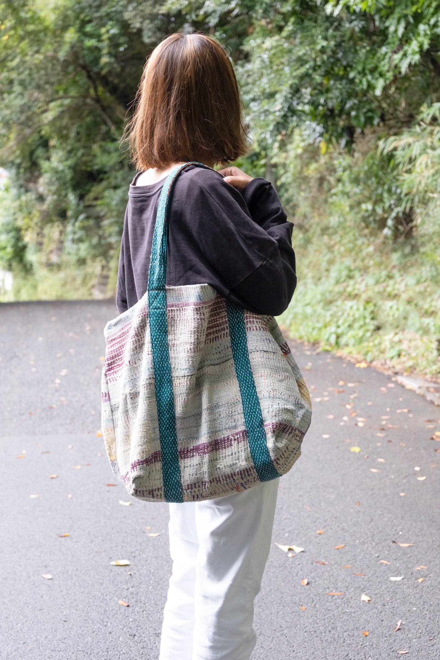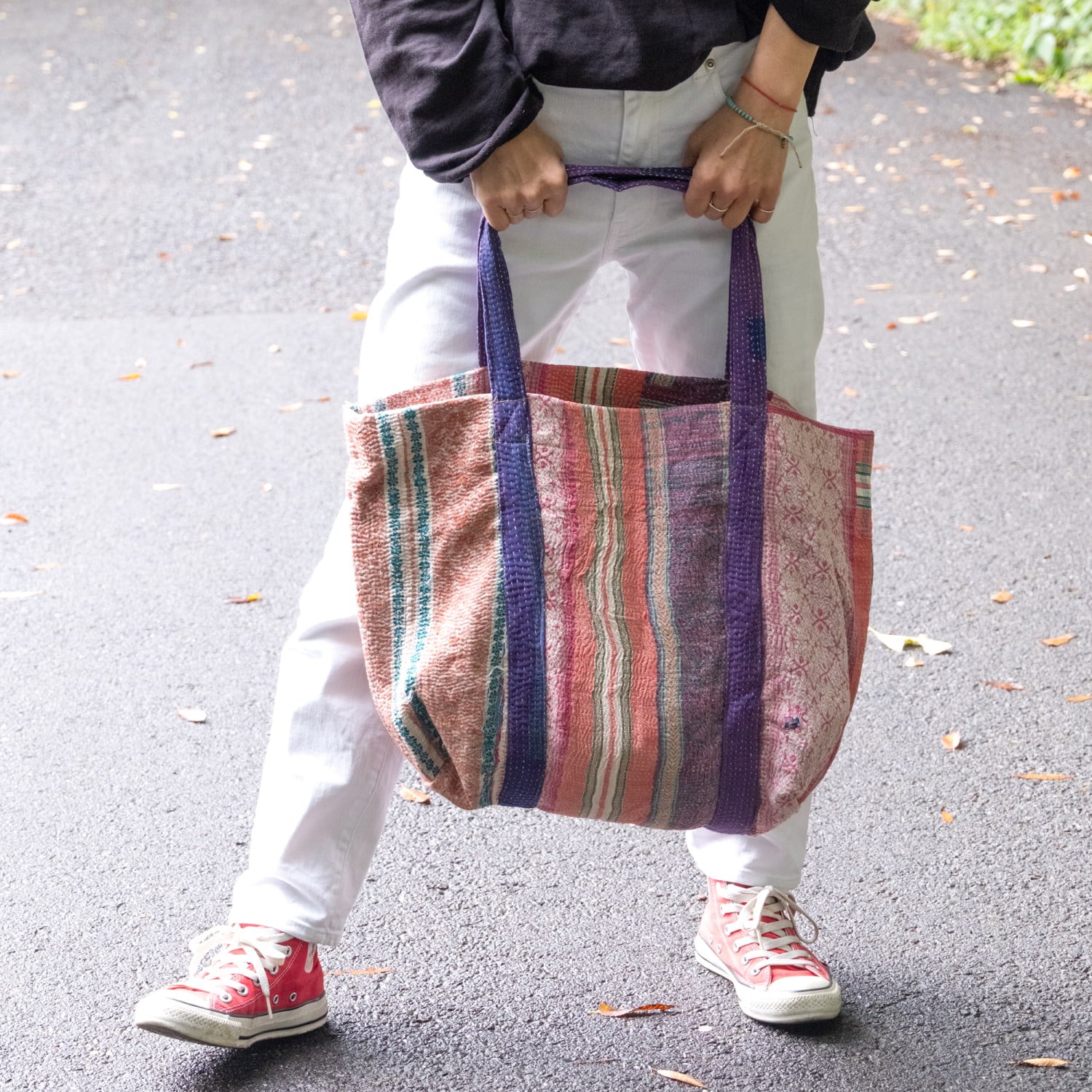 布の端から端までランニングステッチ(刺し子)が施されたカンタ刺繍のトートバッグです。刺繍そのものは単純な刺し子ですが、その刺し子が布地の上を縦横無尽に駆け巡り、日本の刺し子とはまた異なる世界を作り出しています。もともとは東インドのベンガル地方が発祥と言われてるカンタ刺繍。使い古したサリーなどの古い布を何枚も重ね、一針、一針、手仕事で刺し子を施す気が遠くなるような作業ですが、新たな布として生まれ変わったものは布地と糸の色の交じり合った世界がとても美しく、思わずうっとり見入ってしまいます。